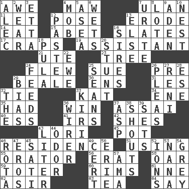 ACROSS 1. Deep reverence 4. Opening into something insatiable 7. Uhlan (variant) 11. Allow 12. Introduce or present, as a question 13. Wear away 14. Consume 15. Collude with 16. Chalkboards 17. Dice game 19. Helper 21. Shoshoni 23. Relationship diagram 24. Soared 25. Institute legal proceedings 26. Before (prefix) 29. Memphis, Tenn. Street 30. Followers of ems 31. French article 32. Neckwear 33. Krazy ___ of comics 34. Compass dir. 35. Possessed 36. Acquire through effort 37. Slender Brazilian palm 40. Double-curved letter 41. Big collection agency 42. "______ My Girl" (Turtles hit) 43. Australian parrot (variant) 45. Plant holder 46. Home 51. Putting into practice 55. Speaker 56. Part of Q.E.F. 58. Rowing implement 59. Carrier 60. Basketball hoops 61. Compass dir. 62. SW Saudi Arabia district 63. Beverage made from leaves 64. Declare DOWN 1. Actor Baldwin 2. Erode 3. Singer James 4. Crowd into 5. At sea 6. Moistens 7. A salt of uric acid 8. Globular water bottle used in Asia 9. Arabian gulf 10. Egg locale 12. Soft color 13. Otherwise 16. Begets 18. Monetary unit of Botswana 20. Difficult or unusual or dangerous feat 22. She-sheep 24. Eats 25. Actors Connery and Penn 26. Entreaties 27. Painter Guido (1575-1642) 28. Compass dir. 29. Prejudice 32. Definite Article 33. Japanese brewing company 36. One who wires 37. Viper 38. Yells 39. Puts into a specified state 43. 61 cubic inches 44. Scent 46. Roll call or roster of names 47. Greek god of love 48. Suttee (variant) 49. Foregone conclusion 50. 4th largest of the Great Lakes 52. Charged particles 53. Grandmother 54. Jennifer or Joel 57. Nanny (var.)