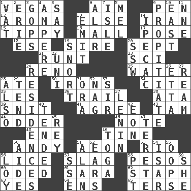 ACROSS 1. Viva Las _ 6. Direct toward a target or goal 9. Fenced enclosure 12. Odor 13. Otherwise 14. SW Asia republic 15. Likely to tip or tilt 16. Shopping center 17. Airs 18. Compass dir. 19. The founder of a family 20. Back-to-school mo. 21. Undersized animal 23. _-fi 24. Former U.S. Attorney General Janet 25. Wetness 28. Had dinner 30. Metal shackles 34. Quote 35. French article 36. Go after with the intent to catch 38. _ moment's notice (2 wds.) 39. In a ____ (agitated or irritated) 41. Match 43. Scottish cap 44. More peculiar 46. Observe 48. Compass dir. 49. Prong on a fork 50. Actor Griffith 51. Age 53. River (Sp.) 56. Louse (plural) 57. Volcanic refuse 58. Mexican monetary units 60. Wrote a lyric poem 61. "Two Mules for Sister ____" 62. Staphylococcus 63. Affirmative reply 64. Followers of ems 65. Laconic DOWN 1. Large container 2. One of the Great Lakes 3. Republicans 4. Electrical Unit 5. Declare 6. Having or resembling wings 7. Small island 8. Cartoonist voice _ Blanc 9. Conciliate 10. Compass direction 11. Compass dir. 13. Give off 14. Medicinal drug used to evoke vomiting 19. Derisive sound 20. Compass dir. 22. Single; one (prefix) 24. Dwellings 26. Singer James 27. 480, 500 or 516 sheets of paper 28. In addition 29. Watch over 31. Mouth or opening 32. Tired old horse 33. Title for a knight 37. Soviet premier 1918-24 40. Watched over 42. Period of immesurable duration 45. Marina Del _, California 47. Cigar-shaped 49. Ancient Roman robe 50. Assistant 51. Actor Alda or Thicke 52. Hearing organs 54. Austrian river, tributary to the Danube 55. I made a mistake 56. Myrna of the movies 57. Compass dir. 58. Pacific Standard Time (abbr.) 59. A female animal or person