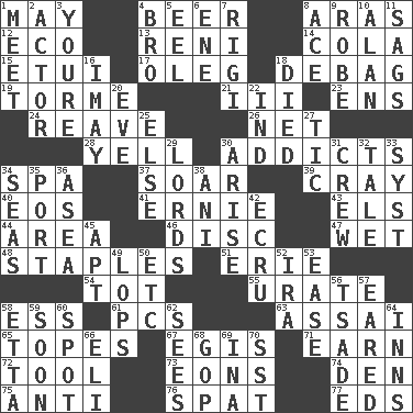 ACROSS 1. Can I? 4. Fermented drink made from hops 8. Caspian sea tributary 12. Environmental prefix 13. Painter Guido (1575-1642) 14. Root beer relative 15. Needle case 17. Cassini of fashion 18. Debunk (Brit. slang) 19. Singer Mel 21. One more than two 23. Followers of ems 24. Rob, plunder, or pillage 26. Fish or hair follower 28. Shout 30. Inveterate users 34. Health resort 37. Fly high 39. Supercomputer manufacturer 40. Greek goddess of the dawn 41. Bert's buddy 43. Raised railways 44. Type of rug 46. Plate 47. Dripping 48. Paper fasteners 51. 4th largest of the Great Lakes 54. Small child 55. A salt of uric acid 58. Double-curved letter 61. Personal Computers (abbr.) 63. Slender Brazilian palm 65. Drinks excessively 67. Armor plate that protects the chest 71. Merit 72. Instrument 73. Immeasurably long periods of time 74. Lair 75. Opposed to 76. Argument over a trivial matter 77. Begley and Asner DOWN 1. Confront 2. Thespian 3. You are 4. Sis' sibling 5. Snakelike fish 6. Compass dir. 7. Swiss mountan, "Queen of the Mountains" 8. Adept person 9. Loose flowing garment 10. Actor Alda or Thicke 11. Droops 16. "If ____ say so..." 18. Passed on 20. First lady 22. Working for oneself (abbr.) 25. Otherwise 27. Nervous spasm 29. Nobles 30. Get up 31. Group working together 32. Lie 33. System (abbr.) 34. Oceans 35. Sweet dark-red dessert wine 36. Toward the sea 38. Cuckoo 42. Shade of tan 45. Fitting 49. Chops off 50. And so on (abbr.) 52. Lyricist Gershwin 53. Comfort 56. Sadhe (variant) 57. Having ears or earlike features 58. Singer James 59. Within a short period 60. Blemish 62. Observes 64. Lodging establishments 66. Biblical high priest 68. Grand Old Party 69. _ tizzy (2 wds.) 70. Fast jet (abbr.)