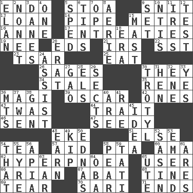 ACROSS 1. Inside; within (prefix) 5. Portico 9. In a ____ (agitated or irritated) 13. Grant temporary use of 14. Corncob 15. Distance measurement (Brit.) 16. Queen of England 1702-14 17. Pleas 19. Born 20. Begley and Asner 21. Big collection agency 22. Fast jet (abbr.) 23. Russian ruler of old 25. Consume 26. Gurus 30. Those things 34. Having lost freshness 35. French philosopher Descartes 36. Wise men 39. Motion picture award 42. Washington bills 43. It was, poetically 44. Distinguishing feature 46. Transmitted 47. Shabby and untidy 48. Supplement with great effort 51. Otherwise 54. Afternoon social gathering 57. Assist 58. Parent Teacher Assoc. 60. Nursemaid (var.) 62. Abnormally rapid or deep breathing 65. One who makes use of a thing 66. Believer in; advocate of (suffix) 67. Blind as ____ 68. Prong on a fork 69. Lacerate 70. Indian skirt 71. Conclusions DOWN 1. Liveliness 2. Music written for nine 3. Natives or inhabitants of Denmark 4. Single 5. Moved rapidly 6. Airtight sealed metal containers 7. Choose 8. Nest on high 9. Arrange properly for use 10. Nuclear Threat Initiatives 11. Angers 12. Trial 15. Vertical spar for supporting sails 18. Period 20. Part of Q.E.F. 24. Help 27. E Mali city 28. Raised railways 29. Religious groups 30. Trinitrotoluene 31. Layer 32. Compass dir. 33. It is so 36. Mountains (abbr.) 37. Deep reverence 38. Separate the seeds from cotton 40. "We ___ not amused" (Victoria) 41. Actress Charlotte 45. The main thing one is thinking about 48. Merit 49. Sleep 50. Ferber et al. 52. Indian antelope 53. Make improvements or corrections to 54. Not this but _ 55. Jane of fiction 56. Capital of Western Samoa 58. Lightbulb-shaped fruit 59. Jacques of French films 61. Ancient Greek god of war 63. Hearing organ 64. Chief or king in Benin or Nigeria 65. Shoshoni