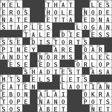 ACROSS 1. Cartoonist voice _ Blanc 4. Not this but _ 8. French article 11. Greek god of love 13. Hollow 14. Thickened enlargement 15. Nathan's nickname 16. Singer James 17. Pulitzer Prize-winning author Ferber 18. Paper fasteners 21. Utah city north of Ogden 22. Lie 23. Expire 25. Double-curved letter 26. Compass dir. 29. What propaganda does 32. Abounding in pines 34. "We ___ not amused" (Victoria) 35. Rowing implement 38. "60 Minutes" Commentator Rooney 39. Typical standards 41. Actor Baldwin 43. Compass dir. 44. Begley and Asner 45. Fourth or lowest deck 46. Most dubious of character or honesty 50. White ___ sheet 51. Mountains (abbr.) 54. Raised railways 55. Allows 57. Ingested 59. Of or relating to Laos or its people 63. Inky black, to poets 64. Jai ____ 67. Gumbo ingredient 68. Drink excessively 69. Billionth: prefix 70. Plant holders 71. Distress signal 72. Collude with 73. Fish or hair follower DOWN 1. Not women's 2. Part of Q.E.F. 3. Globular water bottle used in Asia 4. College papers 5. Being at a high temperature 6. The first octave above the treble staff 7. Beverage made from leaves 8. Cabin 9. Ferber et al. 10. Actors Connery and Penn 12. Back-to-school mo. 14. Modern: prefix 19. Kenny Rogers chart-topper in '80 20. Connecticut Ivy Leaguer 21. Allow 23. Dormintory (informal) 24. Angers 26. Health resort 27. Trig term 28. Extremities 30. Tarsus (plural) 31. Fly high 33. Sight organs 36. Silent film actress Nazimova 37. Vintage cars 39. Actress Patricia 40. Probability 42. Tax preparer (abbr.) 45. "Beetle Bailey" pooch 47. Layer 48. American author Paul (1891-1958) 49. Ocean 51. Confronts 52. Off limits 53. Obstructs or blocks passage 56. Discontinue 58. Compass dir. 60. Image 61. Johnson of "Laugh-In" 62. Political cartoonist Thomas 64. Santa ___, CA 65. Experiment locale 66. A saturated hydrocarbon