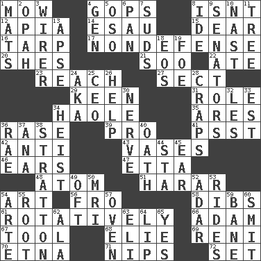 ACROSS 1. Cut the grass 4. Republicans 8. Is not 12. Capital of Western Samoa 14. Son of Isaac 15. Letter starter 16. Canvas cover 17. Unrelated to defense, as in spending 20. "______ My Girl" (Turtles hit) 21. "Barney Miller" actor Jack 22. Had dinner 23. Arrive at 27. Religious group 29. Peachy ____! 31. Hero or heavy, e.g. 34. White Person, in Hawaii 35. Ancient Greek god of war 36. Raze (variant) 39. Adept person 41. Inconspicuous attention getter 42. Opposed to 43. Flower holders 46. Hearing organs 47. Singer James 48. Smallest unit of an element 51. Ethiopian city, capital of Harari 54. Nonscientific branch of learning 56. Back 58. Rights 61. Rotating or pertaining to rotation 66. First of billions? 67. Instrument 68. Writer Wiesel 69. Painter Guido (1575-1642) 70. Inactive volcano in Sicily 71. Cuts off 72. Arrange properly for use DOWN 1. Floor protectors 2. Brightly colored fish 3. One who wires 4. Commissioned military rank (abbr.) 5. Bear (Spanish) 6. Baking dish 7. Soap bubbles 8. Binary compound 9. Legislators 10. Political cartoonist Thomas 11. Woody plant 13. Domed church section 18. Greek goddess of the dawn 19. Enemy 24. Alias (abbr.) 25. Corporate head (abbr.) 26. Assist 28. Dice game 30. Effrontery 32. French article 33. Eastern Standard Time (abbr.) 34. Robbery 36. Actress Charlotte 37. Santa ___, CA 38. Ski resort town in Vermont 40. Pledge 44. R.R. building 45. Hearing organ 49. Often (poetically) 50. Medical imaging device (abbr.) 52. The sixth month of the Jewish calendar 53. Amusement-park features 54. Johnson of "Laugh-In" 55. Carrot, for example 57. Baking chamber 59. Object of repulsion 60. Stricken, poetically 62. In the manner of 63. Biblical high priest 64. Mouth edge 65. Consenting reply