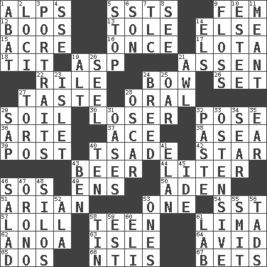 ACROSS 1. High mountains 5. Fast planes 9. Opposite of masc. 12. Scornful sounds 13. Lacquered or enameled metalware 14. Otherwise 15. 1/640 square mile 16. Single time 17. Globular water bottle used in Asia 18. Teat (slang) 19. Viper 21. NE Netherlands city 22. Cause heat under the collar 24. Arrow shooter 26. Arrange properly for use 27. Clothes sense 28. Taken by mouth 29. The visible part of the earth's surface 30. Failure 32. Introduce or present, as a question 36. Johnson of "Laugh-In" 37. Adept person 38. Toward the sea 39. Mail 40. Sadhe (variant) 42. Play the lead 43. Fermented drink made from hops 44. 61 cubic inches 46. Distress signal 49. Followers of ems 50. An important port of Yemen 51. Believer in; advocate of (suffix) 53. Single 54. Fast jet (abbr.) 57. Hang loosely or laxly 58. Adolescent 61. Pale green bean 62. Small Philippine buffalo 63. Capri or Wight 64. Enthusiastic 65. Two (Sp.) 66. Nuclear Threat Initiatives 67. Antes DOWN 1. Blind as ____ 2. Event scenes 3. Likenesses of persons 4. Compass dir. 5. Close up, plug up 6. Manchild 7. Affectionate concern, for short 8. Perceive with the eye 9. Soft thread for cleaning between teeth 10. First name in cosmetics 11. Intended 14. Raised railways 19. Keyboard modifier key 20. Sew up the eyelids of hawks and falcons 21. Leather borer 23. Small island 24. A special lineage 25. Boat paddle 27. "Corrida" creature 28. Witty Wilde 29. Plant excrement 31. Fertile tracts in a desert 32. Thick mixture 33. Clearly or manifestly demonstrative 34. Burn superficially 35. Hearing organ 40. Nine, plus one 41. Enthusiasm 43. Benjamin's nick name 45. Binary compound 46. First course 47. U. of Maine site 48. Grain storage towers 52. Insect wing 53. Singles 55. Stricken, poetically 56. Bits 58. Metal container 59. Eastern Standard Time (abbr.) 60. Biblical high priest 61. Experiment locale