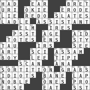 ACROSS 1. Possessed 4. Hearing organ 7. Cy Young winner Saberhagen 11. RI univ. 12. Migrant worker of the '30s 13. Wear away 14. Whopper 15. Do over again 16. Chalkboards 17. Dipping utensil 19. Helper 21. Shade tree 23. Angers 24. Inconspicuous attention getter 25. Mature 26. Help 29. Lugs 30. Followers of ems 31. Filthy place 32. The 19th letter of the Greek alphabet 33. Big collection agency 34. Perceive with the eye 35. Tate display 36. _-fi 37. Indian state 40. Male child 41. Area sheltered from the wind 42. Native american tent (variation) 43. Examine minutely or intensely 45. Santa ___, CA 46. Determination 51. Seizes 55. Foolish or stupid persons 56. Object of repulsion 58. Pet locale 59. Impressive in appearance 60. Washington bills 61. Adept person 62. Celtic language 63. Consume 64. Fast jet (abbr.) DOWN 1. Frame or body of a ship 2. Operatic vocal solo 3. Passed on 4. Supplement with great effort 5. Opera by Verdi 6. Vintage cars 7. Naughty children 8. Round or rotation of duties 9. Paradise 10. Trial 12. Threatening words 13. Otherwise 16. Begets 18. For fear that 20. Attaches a signature 22. Mountains (abbr.) 24. Marked by pouting 25. Nest on high 26. Slender Brazilian palm 27. A whole individual unit 28. Color 29. Edible starchy tuberous root 32. Keyboard key 33. Ancient Celtic tribe of eastern Britain 36. Narrow boards 37. "One Day ___ Time" 38. Burns superficially 39. Practice fight 43. Fur scarf 44. Quote 46. Trig term 47. Aroma 48. Chest bones 49. Mitch Miller's instrument 50. Nanny 52. High mountains 53. Drinking establishments 54. Blemish 57. Fish or hair follower