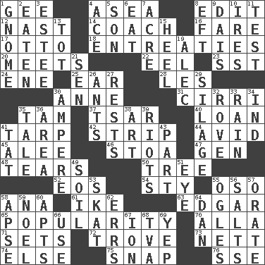 ACROSS 1. Unit of force equal to gravity 4. Toward the sea 8. Prepare for publication 12. Political cartoonist Thomas 14. Team commander 16. Conductor's collection 17. "Beetle Bailey" pooch 18. Pleas 20. Confronts 22. Snakelike fish 23. Fast jet (abbr.) 24. Compass dir. 25. Hearing organ 28. French article 30. Queen of England 1702-14 31. High-altitude cloud 35. Scottish cap 37. Russian ruler of old 40. Grant temporary use of 41. Canvas cover 42. Remove all contents or possession from 44. Enthusiastic 45. Toward shelter 46. Portico 47. Commissioned mil. rank 48. Pulls into pieces 50. Relationship diagram 52. Greek goddess of the dawn 54. Filthy place 55. Bear (Spanish) 58. Santa ___, CA 61. Mamie's mate 63. _ Allan Poe 65. Teen's desire 70. Silent film actress Nazimova 71. Arranges properly for use 72. Collection of objects 73. Remaining after all deductions 74. Otherwise 75. Fastener 76. Compass dir. DOWN 1. Dwarf 2. Consumed 3. First name in cosmetics 4. Adept person 5. Manchild 6. Consume 7. 43,560 square feet 8. Lizard (obsolete) 9. Raised platform 10. Angers 11. Trial 13. Small child 15. Person who is morally reprehensible 19. Actor Baldwin 21. Elected rep. 26. Pismires 27. Musical pauses 29. Fodder prepared in a silo 30. Electrical Unit 32. Be footloose 33. Precipitation 34. Working for oneself (abbr.) 35. Falsehood 36. Type of rug 38. Tate display 39. Debaucheries 41. Make lace 43. Piece 49. The visible part of the earth's surface 51. Sight organ 53. Three-handed card game 55. Stares 56. Table seasonings 57. Declaim 58. Domed church section 59. Christmas carol 60. Tenement units (abbr.) 62. Blunders 64. Daniel's nick name 66. Purpose 67. Electrically charged atom 68. Federal power corp. 69. Slangy assent