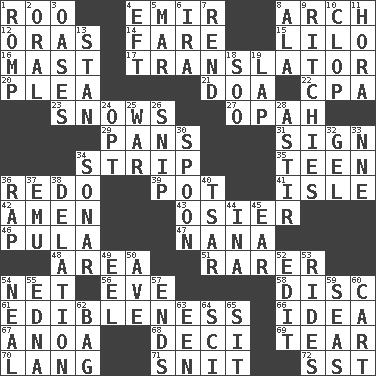ACROSS 1. Friend of Pooh 4. Independent ruler or chieftain 8. Bowlike part 12. Mouths or openings 14. Conductor's collection 15. _ and Stitch 16. Vertical spar for supporting sails 17. Interpreter 20. Entreaty 21. ___ good deed 22. Numbers guy (abbr.) 23. Overwhelms 27. Brightly colored fish 29. Zero-star reviews 31. Public display of a written message 34. Empty completely 35. Adolescent 36. Do over again 39. Plant holder 41. Capri or Wight 42. So be it 43. Flexible twig of a willow tree 46. Monetary unit of Botswana 47. Grandmother 48. Type of rug 51. Less widely known 54. Fish or hair follower 56. First lady 58. Compact _ 61. The property of being fit to eat 66. The content of cognition 67. Small Philippine buffalo 68. Tenth: prefix 69. Separate forcefully 70. Austrian-born American filmmaker Fritz 71. In a ____ (agitated or irritated) 72. Fast jet (abbr.) DOWN 1. Play 2. Relating to the mouth 3. Fertile tracts in a desert 4. Bank Draft (abbr.) 5. Third mo. 6. Lyricist Gershwin 7. Tear apart 8. Insect wing 9. Actors Guy, Robert Welles, and Clint 10. Hoof sound 11. Israeli folk dance 13. Comedian Laurel of Laurel & Hardy 18. "Barney Miller" actor Jack 19. Infant locale 24. Choose 25. Armed conflict 26. Sever or remove by pinching or nipping 28. Being in motion 30. Soup utensil 32. Set 33. Compass dir. 34. Echolocation 36. Strike 37. Australian flightless bird 38. Accusation by an informer 40. Russian ruler of old 44. _ tizzy (2 wds.) 45. Hearing organ 49. Snakelike fish 50. "___ Maria" 52. Prepare for publication 53. Amusement-park features 54. Be tempered by heat 55. Pulitzer Prize-winning author Ferber 57. Conclusions 59. Oceans 60. Haul 62. Paper or plastic container 63. Car or cant ending 64. _-fi 65. Be seated