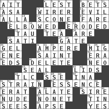 ACROSS 1. Small island 4. For fear that 8. Stakes 12. White ___ sheet 13. One who wires 14. Tending to cause great harm 15. Silent film actress Nazimova 17. Biscuitlike quick bread 18. Conductor's collection 19. Turned at an angle; bent 21. Worn away 23. The 19th letter of the Greek alphabet 24. Beverage made from leaves 26. "We ___ not amused" (Victoria) 27. Suttee (variant) 28. Yard entry 30. Set 31. Electrical Unit 34. Russian fighter aircraft 37. Compass dir. 38. Virtuous person 39. Period 40. Begley and Asner 41. Keyboard key 42. Modern: prefix 43. Lick closed 44. Flaplike coverings 46. Affectionate concern, for short 47. Compass dir. 50. _ tizzy (2 wds.) 51. Put through a sieve 54. Center 57. Part of Q.E.F. 58. Having winglike extensions 60. Male parent of an animal 62. Unadorned 63. Music written for nine 64. Shallow baking pan 65. Observes 66. Domed church section 67. Consenting reply DOWN 1. Auto club (abbr.) 2. Small island 3. Baron Munchausen's specialties 4. It is permitted: Lat. 5. Eat (away) 6. Elected rep. 7. Family _ (genealogy) 8. Prior to 9. Dodge 10. Become fatigued 11. Downhill vehicle 13. Compass dir. 16. Blind as ____ 20. Fr. "Yes" 22. Assign a rank or rating to 25. Rep 27. Transmit 29. Johnson of "Laugh-In" 30. Turn to the right 31. At sea 32. Promenades 33. Sliced dessert 34. Ananias' fault 35. Angers 36. E Mali city 41. Tenth: prefix 43. Chalkboards 44. Whopper 45. Taverns 46. Exchange 48. Seines 49. First name in cosmetics 51. Elected reps. 52. Loyal 53. Grandmother 55. Put into a specified state 56. 4th largest of the Great Lakes 59. Chop off 61. Followers of ems