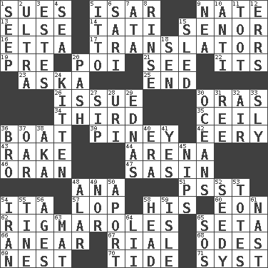 ACROSS 1. Institutes legal proceedings 5. Austrian river, tributary to the Danube 9. Nathan's nickname 13. Otherwise 14. Jacques of French films 15. Sir (Sp.) 16. Singer James 17. Interpreter 19. Before (prefix) 20. Luau course 21. Perceive with the eye 22. ___ a Wonderful Life 23. "____ silly question..." 25. Conclude 26. Come out of 30. Mouths or openings 34. One of three equal parts 35. To provide with a ceiling 36. Water vessel 39. Abounding in pines 42. Suggestive of the supernatural 43. Libertine 44. Sports stadium 46. NW Algerian seaport 47. Indian antelope 48. Santa ___, CA 51. Inconspicuous attention getter 54. Call ___ day 57. Trim (branches) 58. Part of HMS, perhaps 60. Age 62. Complicated, petty procedures 65. Stalk of a moss capsule 66. Approach 67. Monetary unit of Yemen 68. Lyric poems 69. Egg locale 70. Periodic rise and fall of the sea level 71. System (abbr.) DOWN 1. Ooze 2. Extreme 3. _____ Park, CO 4. Ocean 5. "Tell ____ the Marines!" 6. Indian skirt 7. "One Day ___ Time" 8. Remove soap 9. Teachers' org. 10. Against 11. A blast of a horn 12. Blunders 15. Downhill vehicle 18. Elected rep. 20. Romantic infatuation 24. Baby cat 27. Small drink 28. RI univ. 29. Ferber et al. 30. Seas 31. To riddle 32. Atmosphere 33. Secret 36. Sis' sibling 37. Rowing implement 38. Alias (abbr.) 40. Epoch 41. Consenting reply 45. Pinches, bites 48. Having or resembling wings 49. Not either 50. To the left, to Queeg 52. Full of seeds 53. Hauls 54. SW Asia republic 55. Prong on a fork 56. Eras 58. Froth on beer 59. Capri or Wight 61. Political cartoonist Thomas 63. Floor protector 64. Cards in a Roman deck? 65. Mayday