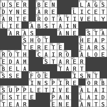ACROSS 1. One who uses or employs something 5. Benjamin's nick name 8. Fails to keep up a pace 12. Centimeter-gram-second unit of force 13. "We ___ not amused" (Victoria) 14. It is permitted: Lat. 15. Johnson of "Laugh-In" 16. Rotating or pertaining to rotation 19. Whopper 20. Choose not to consume 21. Ancient river in northeast Turkey 23. A saturated hydrocarbon 24. R.R. building 27. Guess 30. Pile 31. Cigar-shaped 34. Hearing organs 35. Writer of Portnoy's Complaint (1969) 38. Capital of Egypt 40. Medicinal plant 41. Dutch treat 42. A viewer who gazes fixedly 44. Actor Lugosi 45. Small pie 46. Compass dir. 47. Enemy 50. Is not 53. Motivate 57. Globe 59. Supplying deficiencies 63. Jai _ 64. First name in cosmetics 65. Baking dish 66. Put down 67. Lacerate 68. Compass dir. 69. Pismires DOWN 1. Freehold land 2. Damascus' land 3. Keyboard key 4. Portuguese money of account (variant) 5. Sharp remark 6. Greek god of love 7. Remaining after all deductions 8. 54 in ancient Rome 9. Adept person 10. Set 11. Filthy place 14. Actor's bit 17. American Automobile Association (abbr.) 18. Metal container 20. American tennis player Robert 22. Respiratory problem 24. Lick closed 25. Pacific island yam 26. Domed church section 28. The grampus (Milton) 29. Afternoon social gatherings 30. Centers 32. Teat (slang) 33. Part of Q.E.F. 35. Confederate soldiers (slang) 36. Lyric poems 37. Falsehood 39. Mouth or opening 43. One of the Great Lakes 47. Do some clerical work 48. Single 49. Eastern Standard Time (abbr.) 51. Pitcher Ryan 52. Distinguishing feature 54. Corncob 55. _ the terrible 56. French philosopher Descartes 58. Auction offers 59. Put into a specified state 60. Purpose 61. Parent Teacher Association (abbr.) 62. For each 63. According to