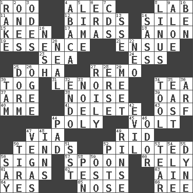 ACROSS 1. Friend of Pooh 4. Actor Baldwin 8. Experiment locale 11. Also 12. Avian creatures 14. Drop; flow; fall 15. Peachy ____! 17. Collect or gather 18. At once, immediately (arch.) 19. Center 21. Take place subsequently 23. Ocean 24. Curvy letter 25. Capital of the state of Qatar 27. San ____ (Riviera town) 30. Coat; cloak 31. Poe poem 34. Afternoon social gathering 37. "We ___ not amused" (Victoria) 38. Annoying sound 39. Rowing implement 40. Madame (abbr.) 41. Keyboard key 43. Order of Saint Francis (abbr.) 44. Many (prefix) 45. Electrical Unit 47. By way of 49. To free from 50. Is inclined (to) 52. Manned the helm 56. Signal 57. Soup utensil 60. Have trust in 61. Ancient river in northeast Turkey 62. Trials 63. The 18th letter of the Arabic alphabet 64. Affirmative reply 65. Olfactory organ 66. To separate or throw off DOWN 1. Immoral or dissolute person 2. Singles 3. Lyric poems 4. Phillipine bananalike plant 5. Welles in "The Third Man" 6. Epoch 7. Music discs 8. "_ and Lucy" (Charlie Brown theme song) 9. _ vera 10. Benjamin's nick name 13. Compass dir. 14. Backtalk 16. Delicate 20. Actress Patricia 22. Modern: prefix 25. Dormintory (informal) 26. Double curve, resembling the letter S 27. Agitated, as a liquid 28. Celtic language 29. Rendezvous 30. Scottish cap 32. Inside; within (prefix) 33. Christmas carol 34. Utensil 35. 90 degrees 36. Sandy's bark 42. Morally bad or wrong 44. Writing tablet 46. Aroma 47. Viva Las _ 48. Restaurants 49. Remove soap 50. Become fatigued 51. Fast jet (abbr.) 52. Cooking vessels 53. Pull into pieces 54. Writer Wiesel 55. Unit of force 56. Declare 58. Fenced enclosure 59. Bear (Spanish)