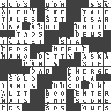 ACROSS 1. Soap bubbles 5. Spanish title 8. Compass dir. 11. Eskimo relative 13. Eisenhower's nickname 14. Story 15. Falsehoods 16. Be seated 17. Austrian river, tributary to the Danube 18. _ tizzy (2 wds.) 19. American tennis player Robert 21. Join together 22. Bits 24. Habitations of wild animals 25. Bathroom plumbing fixture 27. R.R. building 29. Greek god of love 30. Haggard of country music 32. Billionth: prefix 33. Short, simple song 35. "____ silly question..." 39. Leg coverings 41. Proofreading order 42. Male parent 43. Develop 45. Exchanged or delivered for money 48. Root beer relative 49. Makes less strong or intense 50. Parka part 52. Three (prefix) 55. Came down and settled, as after flight 56. Sometimes accompanies a hiss 57. Keyboard key 59. Floor coverings 60. Naughty child 61. Biscuitlike quick bread 62. Begley and Asner 63. Distress signal 64. Singles DOWN 1. Suttee (variant) 2. Uhlan (variant) 3. Conveyance 4. Institute legal proceedings 5. Food container 6. Migrant worker of the '30s 7. Fish or hair follower 8. Indian antelope 9. Narrow boards 10. We are 12. Sadhe (variant) 14. Prong on a fork 20. Fast jet (abbr.) 21. Freehold land 23. Columnist Joseph or Stewart 25. "___ Little Indians" 26. Mouth or opening 27. Put into a specified state 28. Attempt 30. Mountains (abbr.) 31. Artist's stand 33. Heredity factor (abbr.) 34. It would 36. Ski resort town in Vermont 37. Cask 38. Had dinner 40. Does sums 43. Environmental prefix 44. Methods 45. Vegetable dish 46. Leaves out 47. Allows 49. Not wild 50. Same (prefix) 51. I made a mistake 53. French philosopher Descartes 54. Angers 56. Twice 58. Non-commissioned officer (abbr.)
