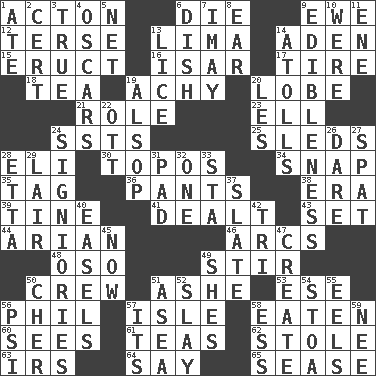 ACROSS 1. Gambison 6. Pass on 9. She-sheep 12. Laconic 13. Pale green bean 14. An important port of Yemen 15. Spew [out] 16. Austrian river, tributary to the Danube 17. Become fatigued 18. Beverage made from leaves 19. Painful 20. Ear part 21. Hero or heavy, e.g. 23. Pipe bend 24. Fast planes 25. Bobsleighs 28. Biblical high priest 30. Literary convention 34. Fastener 35. Label 36. Leg coverings 38. Epoch 39. Prong on a fork 41. Started a card game 43. Put into a specified state 44. Believer in; advocate of (suffix) 46. Arches 48. Bear (Spanish) 49. Disorderly outburst 50. Group working together 51. American tennis player Robert 53. Compass dir. 56. Silvers or Donahue 57. Small island 58. Ingested 60. Perceives with the eye 61. Beverages made from leaves 62. Fur scarf 63. Big collection agency 64. Declare 65. Gospel singer Marvin DOWN 1. Had dinner 2. Certainty 3. Loyal 4. Motion picture awards 5. Fish or hair follower 6. Food container 7. "If ____ say so..." 8. Hearing organ 9. The property of being fit to eat 10. We are 11. Compass dir. 13. Louse (plural) 14. Ringlike coral islands and reefs 19. Columnist Joseph or Stewart 20. French article 22. Baseball player Mel 24. Seigniories (variant) 26. Have the gumption 27. Argument over a trivial matter 28. Singer James 29. Den 31. Groovy apt. 32. Single 33. R.R. building 37. Schedule 40. Artist's stands 42. Three (prefix) 45. At this time 47. Make 49. "______ My Girl" (Turtles hit) 50. "Mermaids" star 51. Toward the sea 52. Kill 54. Portico 55. Snakelike fish 56. Air pressure measure (abbr.) 57. ___ a Wonderful Life 58. Curvy letter 59. Born
