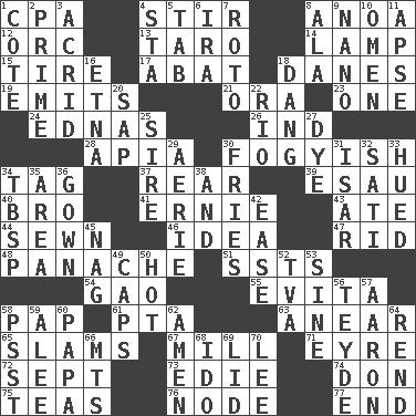 ACROSS 1. Accounting whiz (abbr.) 4. Move through with a circular motion 8. Small Philippine buffalo 12. The grampus (Milton) 13. Pacific island yam 14. Desk light 15. Hoop that covers a wheel 17. Blind as ____ 18. Natives or inhabitants of Denmark 19. Gives off 21. Mouth or opening 23. Single 24. Ferber et al. 26. Indiana (abbr.) 28. Capital of Western Samoa 30. Out of fashion; old fashioned 34. Label 37. Tail end 39. Son of Isaac 40. Sis' sibling 41. Bert's buddy 43. Had dinner 44. Stitched 46. The content of cognition 47. To free from 48. Flamboyance 51. Fast planes 54. E Mali city 55. Webber/Rice musical 58. Infant food 61. Parent Teacher Association (abbr.) 63. Approach 65. Shuts with force 67. Place where flour is made 71. Jane of fiction 72. Back-to-school mo. 73. Singer Brickell 74. Spanish title 75. Afternoon social gatherings 76. Thickened enlargement 77. Conclude DOWN 1. ____ d'Azur (French Riviera) 2. First class 3. Bitter 4. R.R. building 5. Keyboard key 6. Lyricist Gershwin 7. Printing process, for short 8. In the manner of 9. Billionth: prefix 10. Sign of things to come 11. Domed church section 16. Inactive volcano in Sicily 18. Mild oath, euphamism for damn 20. Plant excrement 22. _ de Janeiro 25. Male parent of an animal 27. Color 29. Nest on high 30. Strips of potato fried in deep fat 31. Austrian river, tributary to the Danube 32. Suttee (variant) 33. Took on color 34. Cook's measure (abbr.) 35. Length times width 36. Woman's formal wear 38. Added to 42. Comfort 45. Tired old horse 49. Balmoral and tarboosh 50. Being at a high temperature 52. Federal power corp. 53. Trig term 56. Miss Universe 1986, Barbara Palacios _ 57. Composer Copland 58. Inconspicuous attention getter 59. Toward shelter 60. Dad 62. So be it 64. Tear apart 66. Mountains (abbr.) 68. Wedding promise 69. Hat (slang) 70. Area sheltered from the wind