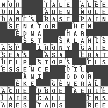 ACROSS 1. And not 4. Story 8. Toward shelter 12. Mouth or opening 13. An important port of Yemen 14. Undercover agent 15. Natives or inhabitants of Denmark 18. Raze (variant) 19. Ache 20. Elected representative 22. Layer 23. Pulitzer Prize-winning author Ferber 24. Impair 25. Fast jet (abbr.) 26. Deli grouping 30. Cleo's killer 33. Literary sarcasm 36. Yard entry 37. Oceans 39. White ___ sheet 40. Part of Q.E.F. 41. Assist 42. Discontinues 44. Raised railways 45. Core 47. Petroleum 50. Cuckoo 51. Scent 53. Make supply last 54. Commissioned military rank 57. 43,560 square feet 59. Mitch Miller's instrument 61. Nest on high 63. Den 64. Give a ring to 65. Followers of ems 66. Ancient Greek god of war 67. Bits 68. To riddle DOWN 1. Allow head to fall sleepily 2. Mouths or openings 3. Indian princess (variant) 4. Edible starchy tuberous root 5. The sixth month of the Jewish calendar 6. French article 7. Compass dir. 8. Electrical Measurement 9. Grant temporary use of 10. Connecticut Ivy Leaguer 11. Car or cant ending 16. Conclusions 17. Without 21. Jacques of French films 22. Actor Linden 24. Fifth month 26. Fastener 27. Female horse 28. Slanted text style (abbr.) 29. Arranges properly for use 30. American tennis player Robert 31. Perceives with the eye 32. Friends 34. Assign a rank or rating to 35. Bear (Spanish) 38. Orators 42. _-fi 43. Within a short period 46. Compass dir. 48. The main thing one is thinking about 49. Old wives' tales, e.g. 52. More valued for its uncommonness 53. 4th largest of the Great Lakes 54. Gilt 55. Snakelike fish 56. Actor's bit 57. Chicken ___ king 58. Automobile 59. Sep. follower 60. Sound made by sheep 62. Compass dir.
