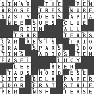 ACROSS 1. Middle Eastern gold or silver currency 6. Definite Article 9. Writing instrument 12. Came up 13. Angers 14. Had on 15. Characterized by obscenity 16. Lairs 17. Capital of Western Samoa 18. Born 19. Takes to court 20. A slight indication 21. It's straight from the horse's mouth 23. 100% 24. Russian ruler of old 25. Pulls apart 28. Automobile 30. Musical pauses 34. Musical group of three 35. Mouth or opening 36. Practice fights 38. Wedding promise 39. Canisters 41. Goodbye (Sp.) 43. Nine, plus one 44. Artist's stand 46. "I Love _" 48. Area sheltered from the wind 49. Fermented drink made from hops 50. Bits 51. Parka part 53. Compass dir. 56. Quote 57. Actor Lugosi 58. Some stationery 60. Aroma 61. Part of Q.E.F. 62. Lacking originality or spontaneity 63. For each 64. Overdraft (abbr.) 65. Laconic DOWN 1. One of the 12 tribes of Israel 2. SW Asia republic 3. Sense of smell 4. Michaelmas daisies 5. Marina Del _, California 6. Relationship diagram 7. Coop moms 8. Curvy letter 9. Teen's desire 10. 4th largest of the Great Lakes 11. Teachers' org. 13. Goddess of spring and wife of Bragi 14. Place for singles 19. Fathers 20. Domesticated feline 22. Ewer handle 24. Interpreter 26. Travel on an animal 27. Within a short period 28. ____ d'Azur (French Riviera) 29. Operatic vocal solo 31. Health resort 32. Bit 33. _ Lanka 37. Having a sole or soles 40. Sowing specialist 42. Institute legal proceedings 45. French article 47. Make 49. Water vessel 50. Event that recurs at intervals 51. Possessive pronoun 52. Norwegian king 54. Practice fight 55. Snakelike fish 56. Police officer (slang) 57. Benjamin's nick name 58. Pacific Standard Time (abbr.) 59. To separate or throw off