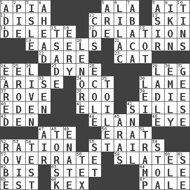 ACROSS 1. Capital of Western Samoa 5. Chicken ___ king 8. Small island 11. Food container 12. Baby bed with high sides 13. What Jean-Claude Killy likes to do 14. Erase 17. Accusation by an informer 19. Artist's stands 21. Oak nuts 22. Have the gumption 23. Feline 24. Snakelike fish 27. Unit of force 29. Part of a journey 32. Get up 34. Sep. follower 36. Unable to walk 37. Be footloose 38. Friend of Pooh 39. Singer Brickell 40. Genesis locale 41. Connecticut Ivy Leaguer 42. Beverly of Met fame 43. Lair 44. Liveliness 46. Sight organ 47. Had dinner 50. Part of Q.E.F. 52. Food allowance for one day 55. Flight of steps 57. Make much ado about nothing 59. Chalkboards 62. Again 63. Proofreading order 64. Undercover agent 65. Eastern Standard Time (abbr.) 66. Dry husk or covering 67. Diluted with white DOWN 1. Find the sum of 2. Sliced dessert 3. Small island 4. Forward in time 5. "We ___ not amused" (Victoria) 6. Pale purple color 7. Phillipine bananalike plant 8. SW Saudi Arabia district 9. Visual representation of an object 10. Metal containers 12. Music discs 15. Sadhe (variant) 16. Suggestive of the supernatural 18. Small child 20. Poe poem 24. Having ears or earlike features 25. Eat (away) 26. Make or become more lively 28. Learning spot: Fr. 29. Dipping utensil 30. Poet Dickinson 31. Honkers 33. Elected rep. 35. Bathroom 36. Luau accessory 42. Slow-paced one 45. Ancient river in northeast Turkey 47. Wind 48. Cod relative 49. Maternal 51. _____ steamer (cargo ship) 52. Loose flowing garment 53. Deliberation 54. Trial 55. Arrange properly for use 56. Portico 58. John Ritter's dad 60. Pipe bend 61. Observe