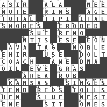ACROSS 1. SW Saudi Arabia district 5. Chicken ___ king 8. Born 11. Musical sound 12. Basketball hoops 14. Mature 15. Add up to 17. Native american tent (variation) 18. Slanted text style (abbr.) 19. Sounds asleep 21. Worn away 23. Take to court 25. San ____ (Riviera town) 26. Nuclear Threat Initiatives 27. Compass dir. 28. A really long time 31. Actress Gardner 33. Label 35. Impressive in appearance 37. Independent ruler or chieftain 38. Purpose 40. Dunce 41. Team commander 43. A saturated hydrocarbon 45. Heredity factor (abbr.) 46. Petroleum 47. She-sheep 50. Pate de foie ____ 52. Type of rug 53. Director Reiner 54. Sunflower state 56. Burns superficially 61. Look after 62. Vintage cars 65. For Whom the Bell _____ 66. Layer 67. Change direction abruptly 68. A home for chicks 69. Compass dir. 70. Be seated 71. Washington bills DOWN 1. Pismires 2. Within a short period 3. "Tell ____ the Marines!" 4. Posterior 5. Tate display 6. Cards in a Roman deck? 7. Electrical Unit 8. Nathan's nickname 9. Mild oath 10. Snakelike fish 13. Founders of families 16. For fear that 18. Wedding promise 20. Set or collection 22. Sign of something about to happen 24. Son of Isaac 26. Drug cop 28. Inky black, to poets 29. Spanish pot 30. Fish or hair follower 31. Mine, in Marseilles 32. Small bottle 34. Girls' org. (abbr.) 36. Probability 37. Environmental prefix 39. Engineer (abbr.) 42. Possessive pronoun 44. Greek god of love 48. Erodes 49. Artist's stands 51. "This won't hurt ____!" 52. Plus 54. Peachy ____! 55. Singer Murray 57. Words to Nanette 58. Small, secluded valley 59. Otherwise 60. Fast planes 61. Definite Article 63. Fr. "Yes" 64. Put into a specified state