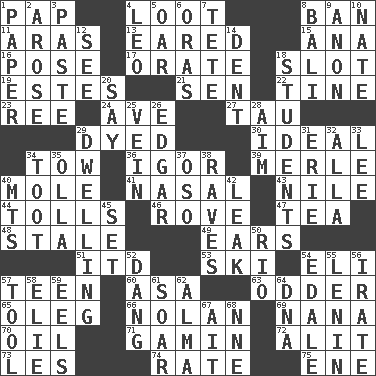 ACROSS 1. Infant food 4. Plunder 8. Prohibit 11. Ancient river in northeast Turkey 13. Having ears or earlike features 15. Santa ___, CA 16. Introduce or present, as a question 17. Declaim 18. Groove 19. _____ Park, CO 21. Elected rep. 22. Prong on a fork 23. To sift 24. "___ Maria" 27. The 19th letter of the Greek alphabet 29. Colored 30. Perfect 34. Pull behind 36. Russian composer Stravinsky 39. Haggard of country music 40. Undercover agent 41. Relating to the nose 43. Mediterranean tributary 44. For Whom the Bell _____ 46. Be footloose 47. Beverage made from leaves 48. Having lost freshness 49. Hearing organs 51. It would 53. What Jean-Claude Killy likes to do 54. Connecticut Ivy Leaguer 57. Adolescent 60. White ___ sheet 63. More peculiar 65. Cassini of fashion 66. Pitcher Ryan 69. Grandmother 70. Lubricate 71. Street urchin 72. Set down 73. French article 74. Pace 75. Compass dir. DOWN 1. Some stationery 2. Came up 3. Thick mixture 4. Lion 5. Rowing implement 6. Mouths or openings 7. Wig 8. Indonesian resort city 9. Soon (poet.) 10. Nathan's nickname 12. Perceive with the eye 14. Scratch 18. SAT takers 20. Declare 25. Distinctive style or manner 26. _ Allan Poe 28. Direct toward a target or goal 29. Residence 31. One of the Great Lakes 32. Silent film actress Nazimova 33. Area sheltered from the wind 34. A blast of a horn 35. Spanish pot 37. Bear (Spanish) 38. All-night dance parties 40. Mountains (abbr.) 42. Path through which fluid escapes 45. Put into a specified state 50. _ de Janeiro 52. Mild oath, euphamism for damn 54. Peak District village in England 55. Soviet premier 1918-24 56. Feeling or showing extreme anger 57. Utensil 58. Writer Wiesel 59. Snakelike fish 61. Fly high 62. _ mater 64. Heredity factor (abbr.) 67. Small island 68. Compass dir.