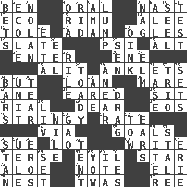 ACROSS 1. Benjamin's nick name 4. Relating to the mouth 8. Political cartoonist Thomas 12. Environmental prefix 13. Tall New Zealand timber tree 14. Toward shelter 15. Lacquered or enameled metalware 17. First of billions? 18. Stares 19. Chalkboard 21. Air pressure measure (abbr.) 23. The first octave above the treble staff 24. Keyboard key 26. Compass dir. 28. Came down and settled, as after flight 30. Short socks 34. With the exception that 37. Grant temporary use of 39. Female horse 40. One (Scot) 41. Having ears or earlike features 43. Be seated 44. Monetary unit of Yemen 46. Letter starter 47. Greek goddess of the dawn 48. Slender, wiry 51. Assign a rank or rating to 54. By way of 55. Scores awarded for successful feats 58. Institute legal proceedings 61. Car dealer's back yard 63. Compose 65. Laconic 67. Morally bad or wrong 71. Play the lead 72. Medicinal plant 73. Musical sound 74. Connecticut Ivy Leaguer 75. Egg locale 76. It was, poetically 77. To riddle DOWN 1. Antes 2. Learning spot: Fr. 3. Pitcher Ryan 4. Mouth or opening 5. To free from 6. Nursemaid (var.) 7. Mass 8. Tired old horse 9. Silent film actress Nazimova 10. Sew up the eyelids of hawks and falcons 11. Trial 16. Singer James 18. Pig sound 20. Snakelike fish 22. Elected rep. 25. Cause heat under the collar 27. Shade tree 29. Sycophant 30. Approach 31. Comfort 32. Musical group of three 33. Puts into a specified state 34. Oblong pieces of solid material 35. A single undivided whole 36. Pull into pieces 38. "We ___ not amused" (Victoria) 42. To trail on the ground 45. 54 in ancient Rome 49. "Death on the ____" 50. E Mali city 52. Pull behind 53. Hearing organs 56. 61 cubic inches 57. Showing deterioration from age 58. Comedian Laurel of Laurel & Hardy 59. Ubangi River tributary 60. Greek god of love 62. Portable shelter 64. One of the Great Lakes 66. Arrange properly for use 68. Promise 69. Call ___ day 70. French article
