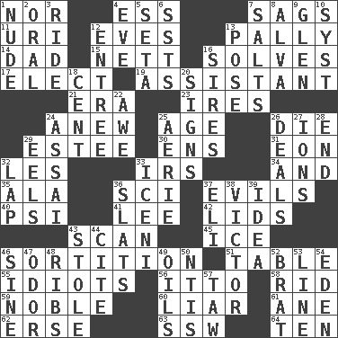 ACROSS 1. Not either 4. Double-curved letter 7. Settles 11. RI univ. 12. Nights before holidays 13. Chummy 14. June honoree 15. Remaining after all deductions 16. Finds the solution 17. Opt 19. Helper 21. Epoch 23. Angers 24. Afresh 25. Mature 26. Pass on 29. First name in cosmetics 30. Followers of ems 31. A really long time 32. French article 33. Big collection agency 34. Also 35. Wing 36. _-fi 37. Vices 40. Air pressure measure (abbr.) 41. Area sheltered from the wind 42. Hats (slang) 43. Examine minutely or intensely 45. Frozen water 46. Conclusion 51. Eating place 55. Foolish or stupid persons 56. "Tell ____ the Marines!" 58. To free from 59. Impressive in appearance 60. One who doesn't tell the truth 61. One (Scot) 62. Celtic language 63. Compass dir. 64. Nine, plus one DOWN 1. Naked 2. Of the mouth 3. Travel on an animal 4. Night before a holiday 5. Stalk of a moss capsule 6. Fast planes 7. Table seasonings 8. Inventor's middle name 9. Small, secluded valley 10. System (abbr.) 12. Main course 13. Introduce or present, as a question 16. Titles for men of rank and authority 18. Penny 20. Omens 22. Deep reverence 24. Slender Brazilian palm 25. Nest on high 26. Allots cards 27. Charged atoms 28. Conclusion 29. Snakelike fish 32. Pet locale 33. Ancient Celtic tribe of eastern Britain 36. Narrow boards 37. Connecticut Ivy Leaguer 38. Winning man's name 39. The content of cognition 43. Fur scarf 44. Quote 46. Trig term 47. Scent 48. Chest bones 49. Petroleums 50. Nuclear Threat Initiatives 52. Naughty child 53. Actor's bit 54. Locale of original sin 57. The 23rd letter of the Hebrew alphabet