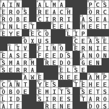 ACROSS 1. The 18th letter of the Arabic alphabet 4. _ mater 8. Personal Computers (abbr.) 11. Greek god of love 13. Arrive at 15. The grampus (Milton) 16. Loose flowing garment 17. High-altitude cloud 18. Toward the sea 19. An arm off of a larger body of water 21. Snakelike fish 22. Rendezvous 23. Sight organ 24. Environmental prefix 27. Mouth edge 29. Amu Darya 30. Desist 34. 54 in ancient Rome 36. Fine (Spanish) 39. Bert's buddy 40. Comfort 41. Eats 43. Soon (poet.) 44. Excessive but superficial compliments 46. Do over again 47. Commissioned military rank (abbr.) 48. Spanish missionary in California 49. Otherwise 51. Deep reverence 53. To sift 54. Electrical Unit 57. Patter 60. It is so 63. Giggle 65. Mitch Miller's instrument 66. Gives off 69. Arranges properly for use 70. Hat (slang) 71. Fathers 72. Edible starchy tuberous root 73. Had dinner 74. French philosopher Descartes 75. Two (Sp.) DOWN 1. Nest on high 2. Literary sarcasm 3. Impressive in appearance 4. Curve 5. Luau accessory 6. Female horse 7. Land measure 8. Introduce or present, as a question 9. Algonquian 10. Go away! 12. Perceive with the eye 14. Land elevation 18. Electrical Measurement 20. John Ritter's dad 25. Sleeve end 26. Flexible twig of a willow tree 28. Frozen water 29. Make much ado about nothing 31. Singer Murray 32. The Jewish people; Israel 33. Car or cant ending 34. Unable to walk 35. Austrian river, tributary to the Danube 37. Born 38. More peculiar 40. Curvy letter 42. Not divided or shared with others 45. Informal term for the mouth 50. Put into a specified state 52. Snake ____ (dice throw) 54. Forward in time 55. Paris' subway 56. Mexican monetary units 57. Root beer relative 58. "This won't hurt ____!" 59. Thickened enlargement 61. Independent ruler or chieftain 62. Male parent of an animal 64. Eastern Standard Time (abbr.) 67. Nine, plus one 68. Compass dir.