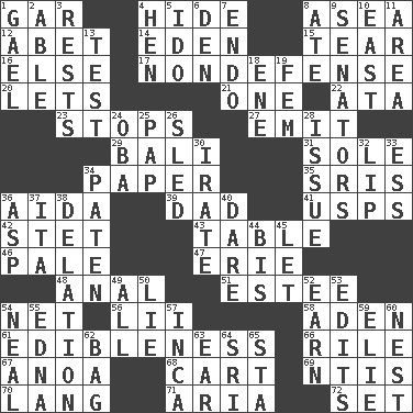 ACROSS 1. Slender fish 4. Flintstone garb 8. Toward the sea 12. Collude with 14. Genesis locale 15. Rend 16. Otherwise 17. Unrelated to defense, as in spending 20. Allows 21. Single 22. "One Day ___ Time" 23. Ceases 27. Give off 29. Indonesian resort city 31. Flatfish 34. Some stationery 35. Indian titles of respect 36. Opera by Verdi 39. Male parent 41. United States Postal Service (abbr.) 42. Proofreading order 43. Eating place 46. Light colored 47. One of the Great Lakes 48. Of or related to the anus 51. First name in cosmetics 54. Fish or hair follower 56. Cards in a Roman deck? 58. An important port of Yemen 61. The property of being fit to eat 66. Cause heat under the collar 67. Small Philippine buffalo 68. Haul 69. Nuclear Threat Initiatives 70. Austrian-born American filmmaker Fritz 71. Roberta Peters solo 72. Put into a specified state DOWN 1. Highlander 2. Competent 3. Musical pauses 4. Layer 5. Wedding promise 6. Lair 7. Inside; within (prefix) 8. Had dinner 9. Elected representatives 10. Compass direction 11. Type of rug 13. Trial 18. Compass dir. 19. Opposite of masc. 24. Chief or king in Benin or Nigeria 25. Infant food 26. Downhill vehicle 28. Come out of 30. Feeling or showing extreme anger 32. Mouth edge 33. Double-curved letter 34. Eucharist need 36. Cleo's killer 37. Call ___ day 38. Conveyance 40. Have the gumption 44. Again 45. Allow 49. 100% 50. Whopper 52. Merit 53. Prepares for publication 54. Be tempered by heat 55. Pulitzer Prize-winning author Ferber 57. South American Indian 59. Writer Wiesel 60. Egg locale 62. Paper or plastic container 63. Hearing organ 64. _ Lanka 65. R.R. building