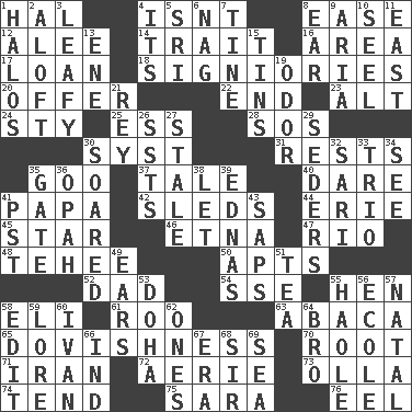 ACROSS 1. Actor Linden 4. Is not 8. Comfort 12. Toward shelter 14. Distinguishing feature 16. Length times width 17. Grant temporary use of 18. Seigniories (variant) 20. Auction bid 22. Conclude 23. The first octave above the treble staff 24. Filthy place 25. Double-curved letter 28. Mayday 30. System (abbr.) 31. Musical pauses 35. Thick or sticky substance 37. Story 40. Have the gumption 41. Dad 42. Bobsleighs 44. One of the Great Lakes 45. Play the lead 46. Inactive volcano in Sicily 47. _ de Janeiro 48. Giggle 50. Tenement units (abbr.) 52. Male parent 54. Compass dir. 55. Layer 58. Biblical high priest 61. Friend of Pooh 63. Phillipine bananalike plant 65. Innocence, gentleness, or tenderness 70. Carrot, for example 71. SW Asia republic 72. Nest on high 73. Water jar 74. Watch over 75. "Two Mules for Sister ____" 76. Snakelike fish DOWN 1. Auras 2. High up in or into the air 3. Like summer trees 4. ___ a Wonderful Life 5. Indian title of respect (Mr.) 6. Tired old horse 7. Prong on a fork 8. Hearing organ 9. Operatic vocal solo 10. Sew up the eyelids of hawks and falcons 11. Compass direction 13. Compass dir. 15. Canisters 19. Scent 21. Marina Del _, California 26. Fast planes 27. Having lost freshness 29. Spring feasts 30. Flew 32. Indian skirt 33. Musical group of three 34. Observe 35. Yard entry 36. Brightly colored fish 38. Allow 39. Ferber et al. 41. Pacific Standard Time (abbr.) 43. Plant excrements 49. Hearing organs 51. Beverage made from leaves 53. Capital of the state of Qatar 55. White Person, in Hawaii 56. Learning spot: Fr. 57. Relating to or accompanying birth 58. Prepare for publication 59. Old wives' tales, e.g. 60. _ the terrible 62. Singles 64. Sis' sibling 66. Working for oneself (abbr.) 67. Epoch 68. Title for a knight 69. Ocean