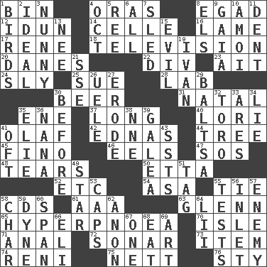 ACROSS 1. Storage container 4. Mouths or openings 8. Mild oath 12. Goddess of spring and wife of Bragi 14. Cell (Danish) 16. Unable to walk 17. French philosopher Descartes 18. Boob tube 20. Natives or inhabitants of Denmark 22. HTML Container Element 23. Small island 24. Cunning 25. Institute legal proceedings 28. Experiment locale 30. Fermented drink made from hops 31. Brizilian seaport 35. Compass dir. 37. Having great length 40. Australian parrot (variant) 41. Norwegian king 42. Ferber et al. 44. Relationship diagram 45. Fine (Spanish) 46. Snakelike fish 47. Distress signal 48. Lacerates 50. Singer James 52. And so on (abbr.) 54. White ___ sheet 55. Neckwear 58. Music discs 61. Auto club (abbr.) 63. American astronaut and politician John 65. Abnormally rapid or deep breathing 70. Capri or Wight 71. Of or related to the anus 72. Echolocation 73. Detail 74. Painter Guido (1575-1642) 75. Remaining after all deductions 76. Filthy place DOWN 1. Avian creatures 2. Standard of perfection 3. Pet term 4. Sep. follower 5. To riddle 6. 100% 7. Downhill vehicle 8. Raised railways 9. Greek goddess of the earth (variant) 10. Mine, in Marseilles 11. Scratch 13. Born 15. Morally bad or wrong 19. _ the terrible 21. Compass dir. 26. Ubangi River tributary 27. Eat (away) 29. Greek mezzo-soprano Agnes 30. Prior to 32. "Corrida" creature 33. Ancient Greek god of war 34. Whopper 35. Writer Wiesel 36. Nanny 38. Compass dir. 39. An organ shaped like a helmet 41. Often (poetically) 43. Fast planes 49. Play the lead 51. Label 53. Balmoral and tarboosh 55. Trials 56. An arm off of a larger body of water 57. Foe 58. Burn to charcoal 59. Centimeter-gram-second unit of force 60. Connect, as a bridge 62. At once, immediately (arch.) 64. Cards in a Roman deck? 66. Biblical high priest 67. Single 68. Erode 69. Tate display