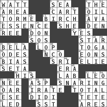 ACROSS 1. Electrical Unit 5. Ocean 8. Definite Article 11. Length times width 12. Haul 14. Petroleum 15. Singer Mel 17. A tree used for making furniture 18. Actress Gardner 19. Gist 21. A female animal or person 22. Lair 23. To riddle 24. Spanish title 25. Affirmative reply 27. Mayday 28. Play the lead 31. Actor Lugosi 35. Chop off 37. Ancient Roman robe 38. Lyric poems 39. Non-commissioned officer (abbr.) 41. Immeasurably long periods of time 42. Prejudice 43. Indian title of respect (Mr.) 45. Writer Wiesel 46. Stalk of a moss capsule 47. Period 49. Part of HMS, perhaps 51. Experiment locale 52. Lion 55. Born 57. Cleo's killer 60. Catching in a trap 62. Boat paddle 63. Feeling or showing extreme anger 65. "_____ Recall" 66. Compass dir. 67. "You Light Up My Life" star Conn 68. False hair 69. Directed 70. Fast jet (abbr.) 71. Ancient Greek god of war DOWN 1. Wetness 2. Came up 3. Laconic 4. Not wild 5. _-fi 6. Hearing organs 7. Bowlike part 8. Inedible or poisonous agaric 9. Hub of activity 10. Flair 13. Those people 16. Extremities 17. Gillaume's butler role 20. Calm and collected 26. First name in cosmetics 29. Hindu god of fire 30. Raze (variant) 31. Moves up and down 32. Singer Brickell 33. Tough but pliablecoriaceous 34. Slender Brazilian palm 36. Personal Computers (abbr.) 40. Threatening words 44. SW Asia republic 48. Blind as ____ 50. Stated 52. 61 cubic inches 53. Maternal 54. Stares at amorously 55. Christmas carol 56. Comfort 58. Indian titles of respect 59. Groovy apts. 61. Round or rotation of duties 64. Teat (slang)