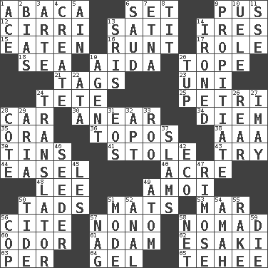 ACROSS 1. Phillipine bananalike plant 6. Put into a specified state 9. Fluid product of inflammation 12. High-altitude cloud 13. Suttee (variant) 14. Angers 15. Eroded 16. The smallest animal of a litter 17. Hero or heavy, e.g. 18. Ocean 19. Opera by Verdi 20. Drink excessively 21. Labels 23. Single; one (prefix) 24. False hair 25. _ dish (used to culture cells) 28. 4-wheeled motor vehicle 30. Approach 34. South Vietnam president (1954) 35. Mouth or opening 36. Literary convention 38. Auto club (abbr.) 39. Metal containers 41. Fur scarf 43. Attempt to accomplish something 44. Artist's stand 46. Measure of real estate 48. Area sheltered from the wind 49. Mine, in Marseilles 50. Bits 51. Floor coverings 53. Make imperfect 56. Quote 57. Words to Nanette 58. Roamer 60. Scent 61. First man 62. 1973 Nobel Price Winner (Physics) Leo 63. For each 64. Set 65. Giggle DOWN 1. Adept person 2. Prejudice 3. Johnson of "Laugh-In" 4. Make 5. The 18th letter of the Arabic alphabet 6. Saudi Arabian king (1953-1964) 7. Inactive volcano in Sicily 8. Teat (slang) 9. Appease 10. Ubangi River tributary 11. Compass dir. 13. Indian titles of respect 14. Pressed 19. Rep 20. Uncastrated adult male sheep 22. "One Day ___ Time" 24. Interpreter 26. Rump 27. "If ____ say so..." 28. ____ d'Azur (French Riviera) 29. Roberta Peters solo 31. Greek goddess of the dawn 32. Fitting 33. Friend of Pooh 37. Criticizes harshly 40. Sowing specialist 42. Environmental prefix 45. French article 47. Full of chinks, cracks, or crevices 49. Smallest unit of an element 50. Event that recurs at intervals 51. Method 52. Of or related to the anus 54. Nursemaid 55. Libertine 56. Police officer (slang) 57. Tired old horse 58. Fish or hair follower 59. Pass on