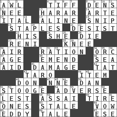 ACROSS 1. Leather borer 4. Small quarrel 8. Lairs 12. Born 13. Ethiopian city, capital of Harari 14. Johnson of "Laugh-In" 15. Slanted text style (abbr.) 17. Place in a line 18. Sever or remove by pinching or nipping 19. Paper fasteners 21. Cease 23. Part of HMS, perhaps 24. A female animal or person 26. Expire 27. Painter Guido (1575-1642) 28. Leg joint 30. Wind 31. Food allowance for one day 34. The grampus (Milton) 37. Grow older 38. Make improvements or corrections to 39. Ocean 40. Help 41. Break 42. Make lace 43. Edible starchy tuberous root 44. A whole individual unit 46. Spanish title 47. Compass dir. 50. Daniel's nick name 51. Moe Howard, for one 54. Contrary to your interests or welfare 57. For fear that 58. Slender Brazilian palm 60. Become fatigued 62. Singles 63. Lacking originality or spontaneity 64. Solemn pledge 65. Whirlpool 66. Lie 67. Compass dir. DOWN 1. Black tropical American cuckoo 2. Soaks 3. Resembling or made to resemble leather 4. Stories 5. From or relating to Ireland 6. Avid follower 7. Flintstone 8. Hyrax 9. Bert's buddy 10. Nuclear Threat Initiatives 11. Back-to-school mo. 13. Actor Linden 16. (Had) reclined 20. 23rd letter of the Greek alphabet 22. Genesis locale 25. Supplementing with great effort 27. Swiss mountan, "Queen of the Mountains" 29. Connecting point 30. Auto club (abbr.) 31. Stern 32. ID or VA city 33. Beverage made from leaves 34. Clearly or manifestly demonstrative 35. 480, 500 or 516 sheets of paper 36. Feline 41. Mild oath, euphamism for damn 43. A girl or young woman (variant) 44. Binary compound 45. Small pie 46. Administered medicine 48. Rhinal 49. Peak District village in England 51. _ gin 52. Watch over 53. Compass direction 55. Compete 56. Greek god of love 59. R.R. building 61. She-sheep