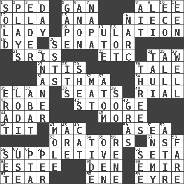 ACROSS 1. Hurried 5. Separate the seeds from cotton 8. Toward shelter 12. Rounded earthenware pot or jar 13. Santa ___, CA 14. Sibling's daughter 15. Kenny Rogers chart-topper in '80 16. Census information 19. Color 20. Elected representative 21. Indian titles of respect 23. And so on (abbr.) 24. The 23rd letter of the Hebrew alphabet 27. Nuclear Threat Initiatives 30. Story 31. Respiratory problem 34. Frame or body of a ship 35. Flair 38. Theater features 40. Monetary unit of Yemen 41. Loose flowing garment 42. Moe Howard, for one 44. The sixth month of the Jewish calendar 45. Greater amount 46. Teat (slang) 47. Apple computer (short form) 50. Toward the sea 53. Speakers 57. Overdraft (abbr.) 59. Supplementary 63. Stalk of a moss capsule 64. First name in cosmetics 65. Lair 66. Independent ruler or chieftain 67. Pull apart 68. Compass dir. 69. Jane of fiction DOWN 1. Disposed of to a purchaser 2. Frolics 3. A person who is older than you are 4. 24 hours 5. Yawn 6. Soon (poet.) 7. California wine valley 8. Small island 9. Luau accessory 10. Environmental prefix 11. Car or cant ending 14. Drug cop 17. Shoshoni 18. Car dealer's back yard 20. Fast planes 22. More empty; more void 24. "Change" in Tahitian 25. Silent film actress Nazimova 26. Water source 28. ___ a Wonderful Life 29. "______ My Girl" (Turtles hit) 30. Trios 32. Floor protector 33. Smallest unit of an element 35. Part of Q.E.F. 36. Farming town in central California 37. Blind as ____ 39. "Barney Miller" actor Jack 43. Pate de foie ____ 47. Undercover agent 48. "We ___ not amused" (Victoria) 49. Domesticated feline 51. Foe 52. Moving or stirring 54. Periodic rise and fall of the sea level 55. Baking chamber 56. French philosopher Descartes 58. Conductor's collection 59. Put into a specified state 60. Purpose 61. Parent Teacher Assoc. 62. For each 63. Observe