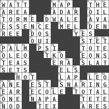 ACROSS 1. Electrical Unit 5. Atlas unit 8. Definite Article 11. Length times width 12. The sixth month of the Jewish calendar 14. Petroleum 15. Singer Mel 17. A sleeping potion; an opiate (poet.) 18. Actress Gardner 19. Core 21. Cartoonist voice _ Blanc 22. Lair 23. Portuguese money of account (variant) 24. Two (Sp.) 25. Affirmative reply 27. Fr. "Yes" 28. Proofreading order 31. Inside of hand 35. 23rd letter of the Greek alphabet 37. Carryall 38. Butter sub 39. Ring climax 41. Immeasurably long periods of time 42. Beverages made from leaves 43. Period 45. Narrow board 46. Arranges properly for use 47. Raised railways 49. Being at a high temperature 51. Pet locale 52. Lion 55. One (Scot) 57. Eastern Standard Time (abbr.) 60. Catching in a trap 62. Hearing organ 63. Learning spot: Fr. 65. "_____ Recall" 66. Single 67. California wine valley 68. Wig 69. Dreamland 70. John Ritter's dad 71. Ancient Greek god of war DOWN 1. Wetness 2. Came up 3. Laconic 4. Not wild 5. Opening into something insatiable 6. First of billions? 7. Light colored 8. Inedible or poisonous agaric 9. Hub of activity 10. Liveliness 13. Trust 16. Inside; within (prefix) 17. Cease 20. Clever action or accomplishment 26. _____ Park, CO 29. Inactive volcano in Sicily 30. Trial 31. Cooking vessels 32. Toward shelter 33. Tough but pliablecoriaceous 34. With motion or animation 36. Eisenhower's nickname 40. Threatening words 44. Actor Alda or Thicke 48. Petty quarrel 50. Adolescent 52. 61 cubic inches 53. Related on the mother's side 54. Stares at amorously 55. Period of immesurable duration 56. Billionth: prefix 58. Get outta here! 59. Drink excessively 61. Round or rotation of duties 64. Not strict