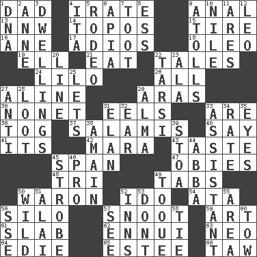 ACROSS 1. June honoree 4. Feeling or showing extreme anger 9. Of or related to the anus 13. Compass dir. 14. Literary convention 15. Become fatigued 16. One (Scot) 17. Goodbye (Sp.) 18. Margarine 19. Pipe bend 21. Erode 22. Stories 24. _ and Stitch 26. 100% 27. Place in a line 29. Caspian sea tributary 30. Music written for nine 31. Snakelike fish 33. "We ___ not amused" (Victoria) 36. Coat; cloak 37. Deli grouping 40. Declare 41. It is 42. Hindu Mythology: god of death 43. Clothes sense 45. Connect, as a bridge 47. Off-Broadway awards 48. Three (prefix) 49. Bar bills 50. Make _____ (do battle with) 52. Wedding promise 54. "One Day ___ Time" 56. Grain storage tower 57. Snob 59. Nonscientific branch of learning 61. Broad, flat, thick piece 62. World-weariness 63. Modern: prefix 64. Singer Brickell 65. First name in cosmetics 66. The 23rd letter of the Hebrew alphabet DOWN 1. Heredity factor (abbr.) 2. Queen of England 1702-14 3. Residences 4. Call ___ day 5. Cowboy competition 6. Capital of Western Samoa 7. A blast of a horn 8. Double-curved letter 9. Ringlike coral islands and reefs 10. "Death on the ____" 11. Ancient Greek god of war 12. Lion 20. Actor's bit 22. Tarsus (plural) 23. Wing 25. Allows 27. Opposed to 28. Plunder 29. _ mater 31. Liveliness 32. Ewer handle 33. Aide 34. Pace 35. Sight organs 38. With great haste 39. Portico 44. Swedish rock group 45. Disco prop 46. Adept person 49. Woman's close-fitting hat 50. Uncontrolled 51. Jai _ 52. Restaurants 53. Do not 55. Length times width 56. Compass dir. 57. Perceive with the eye 58. Neckwear 60. Pull behind