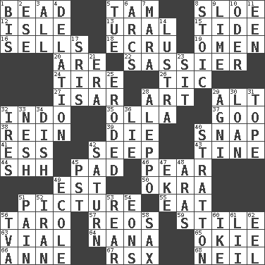 ACROSS 1. Necklace unit 5. Scottish cap 8. _ gin 12. Capri or Wight 13. Mountain range 15. Event that recurs at intervals 16. Makes a sale 18. Shade of tan 19. Presage 20. "We ___ not amused" (Victoria) 22. More disrespectful 24. Become fatigued 26. Nervous spasm 27. Austrian river, tributary to the Danube 28. Tate display 29. Keyboard modifier key 32. _ china 35. Rounded earthenware pot or jar 37. Thick or sticky substance 38. It's straight from the horse's mouth 39. Expire 40. Fastener 41. Curvy letter 42. Ooze 43. Prong on a fork 44. Quiet! 45. Groovy apt. 46. Lightbulb-shaped fruit 49. Eastern Standard Time (abbr.) 50. Gumbo ingredient 51. Photo 55. Erode 56. Edible starchy tuberous root 57. Vintage cars 59. Vertical member of a panel or frame 63. Small bottle 64. Grandmother 65. Migrant worker of the '30s 66. Singer Murray 67. Acura sports coupe 68. Famous astronaut Armstrong DOWN 1. Twice 2. Compass dir. 3. 100% 4. Accusation by an informer 5. Third day of the wk. 6. Curves 7. Hindu Mythology: god of death 8. Unemotional 9. Welles in "The Third Man" 10. River in Europe 11. Car or cant ending 14. A period of five years 17. Indian titles of respect 21. Period 23. Be seated 25. Eaten away 28. City in Syria 29. Hindu god of fire 30. Grant temporary use of 31. Drink excessively 32. Angers 33. Soft 34. Food container 36. Untruth 40. Ski resort town in Vermont 42. Titan orbits this 45. Pacific Standard Time (abbr.) 47. Make supply last 48. Caspian sea tributary 49. Learning spot: Fr. 51. Ache 52. SW Asia republic 53. Rump 54. Immeasurably long periods of time 56. Federal power corp. 58. Saxophone 60. Eisenhower's nickname 61. Cards in a Roman deck? 62. Snakelike fish