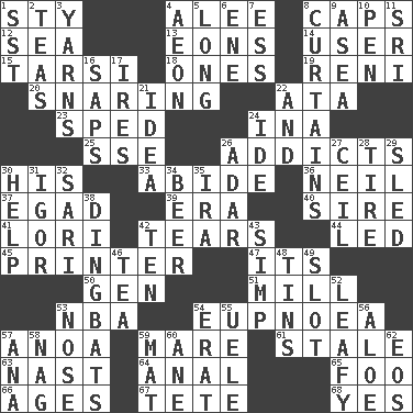 ACROSS 1. Filthy place 4. Toward shelter 8. Smile enhancers 12. Ocean 13. Immeasurably long periods of time 14. One who uses or employs something 15. Tarsus (plural) 18. Washington bills 19. Painter Guido (1575-1642) 20. Catching in a trap 22. "One Day ___ Time" 23. Hurried 24. _ tizzy (2 wds.) 25. Compass dir. 26. Inveterate users 30. Part of HMS, perhaps 33. Stay 36. Famous astronaut Armstrong 37. Mild oath 39. Epoch 40. Title for a man of rank and authority 41. Australian parrot (variant) 42. Separates forcefully 44. Directed 45. Hard copy producer 47. ___ a Wonderful Life 50. Commissioned military rank (abbr.) 51. Place where flour is made 53. Basketball assoc. 54. Normal relaxed breathing 57. Small Philippine buffalo 59. Female horse 61. Having lost freshness 63. Political cartoonist Thomas 64. Of or related to the anus 65. Egg _ yung 66. Eons 67. False hair 68. Affirmative reply DOWN 1. Fast jet (abbr.) 2. Beverages made from leaves 3. Tall tales 4. Age 5. Protracted 6. Compass dir. 7. Double-curved letter 8. Window treatments 9. Toward the sea 10. Writing instrument 11. _ Lanka 16. Plant excrements 17. Angers 21. The content of cognition 22. Also 24. Binary compound 26. The sixth month of the Jewish calendar 27. To provide with a ceiling 28. Become fatigued 29. Downhill vehicle 30. Aid 31. Composer Stravinsky 32. Indian skirt 34. Fermented drink made from hops 35. Retirement account (abbr.) 38. Empty-headed or silly people 42. Nine, plus one 43. Simple or foolish person 46. Beverage made from leaves 48. Canisters 49. Narrow opening 52. Like summer trees 53. Olfactory organ 54. Part of Q.E.F. 55. Ubangi River tributary 56. Medicinal plant 57. Santa ___, CA 58. Tired old horse 59. Floor covering 60. A saturated hydrocarbon 62. Greek goddess of the dawn