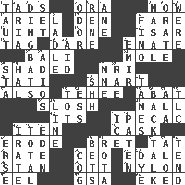 ACROSS 1. Small boys 5. Mouth or opening 8. Immediately 11. Satellite of Uranus 13. Lair 14. Conductor's collection 15. National forest in Provo, Utah 16. Single 17. Austrian river, tributary to the Danube 18. Label 19. Have the gumption 21. Maternal 22. Indonesian resort city 24. Undercover agent 25. Cast a shadow over 27. Medical imaging device (abbr.) 29. Jacques of French films 30. Don Adams' spy role 32. In addition 33. Giggle 35. Blind as ____ 39. Agitate, as a liquid 41. Shopping center 42. ___ a Wonderful Life 43. Medicinal drug used to evoke vomiting 45. A whole individual unit 48. Keg 49. Wear away 50. Cy Young winner Saberhagen 52. Make lace 55. Pace 56. Corporate head (abbr.) 57. Peak District village in England 59. Comedian Laurel of Laurel & Hardy 60. Baseball player Mel 61. Thermoplastic polyamide 62. Snakelike fish 63. Girls' org. (abbr.) 64. Made supply last DOWN 1. Drawn tight 2. Operatic vocal solo 3. Empty-headed or silly people 4. Arrange properly for use 5. Aroma 6. French philosopher Descartes 7. A saturated hydrocarbon 8. Relating to the nose 9. Speak pompously 10. We are 12. Dipping utensil 14. A pale, very dry sherry 20. Help 21. Independent ruler or chieftain 23. Goodbye (Sp.) 25. R.R. building 26. Actor Linden 27. Madame (abbr.) 28. Actress Charlotte 30. Quiet! 31. Corrects by punishment or discipline 33. Small child 34. Double-curved letter 36. Sass 37. According to 38. Affectionate concern, for short 40. Welles in "The Third Man" 43. Frozen water 44. Eucharist need 45. Feeling or showing extreme anger 46. "_____ Recall" 47. Locale of original sin 49. Celtic language 50. Stakes 51. Roll call or roster of names 53. Medicinal plant 54. Be inclined (to) 56. Gear tooth 58. Color