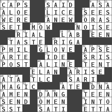 ACROSS 1. Smile enhancers 5. Expressed in words 9. White ___ sheet 12. Medicinal plant 13. Louse (plural) 14. Perceives with the eye 15. Past tense of be (plural) 16. Afresh 17. Mouths or openings 18. Put into a specified state 19. Cut the grass 21. Annoying sound 22. Monetary unit of Yemen 24. Experiment locale 26. Car or cant ending 27. Clothes sense 28. Capital of Latvia 29. Silvers or Donahue 30. Michael Jackson trademark 32. Domed church section 36. Johnson of "Laugh-In" 37. Binary compound 38. Indian titles of respect 39. Mail 40. Place in a line 42. Portable shelter 43. Enthusiasm 44. Get up 46. "One Day ___ Time" 49. Affectionate concern, for short 50. Indian skirt 51. Mysterious quality of enchantment 53. Had dinner 54. Heredity factor (abbr.) 57. So be it 58. Mild oath, euphamism for damn 61. Adolescent 62. Transmit 63. Sign of something about to happen 64. To the inside or interior of 65. Fast jet (abbr.) 66. Suttee (variant) 67. Singer James DOWN 1. Crow sounds 2. Toward shelter 3. Likenesses of persons 4. Observe 5. Cole _ (cabbage dish) 6. The 18th letter of the Arabic alphabet 7. Frozen water 8. Morning condensation 9. Nest on high 10. Gospel singer Marvin 11. NE Netherlands city 14. "Barney Miller" actor Jack 19. Floor covering 20. Cassini of fashion 21. Basketball assoc. 23. Small island 24. Make or become more lively 25. Grow older 27. Through, poetically 28. "The Thinker" sculptor 29. Infant food 31. Pale purple color 32. Moving or stirring 33. Elected leader of a country 34. Trig term 35. Eastern Standard Time (abbr.) 40. 100% 41. Compass direction 43. And so on (abbr.) 45. Actress Charlotte 46. Collect or gather 47. Corrects by punishment or discipline 48. Rep 52. Indiana (abbr.) 53. Hindu god of fire 55. Remaining after all deductions 56. Small Philippine buffalo 58. Two (Sp.) 59. Nursemaid (var.) 60. Fish or hair follower 61. Neckwear