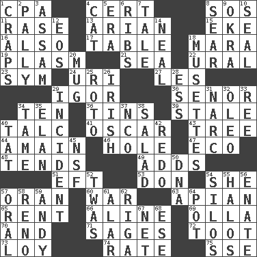 ACROSS 1. Tax preparer (abbr.) 4. Sure thing 8. Mayday 11. To erase 13. Believer in; advocate of (suffix) 15. Supplement with great effort 16. In addition 17. Eating place 18. Hindu Mythology: god of death 19. Suffix with ecto or cyto 21. Ocean 22. Mountain range 23. Symbol (abbr.) 24. RI univ. 27. French article 29. Russian composer Stravinsky 30. Sir (Sp.) 34. "___ Little Indians" 36. Canisters 39. Showing deterioration from age 40. Baby powder 41. Witty Wilde 43. Woody plant 44. At full speed 46. Hollow 47. Environmental prefix 48. Is inclined (to) 49. Sums up 51. Bank Draft (abbr.) 53. Spanish title 54. A female animal or person 57. Northwest Algerian city 60. Armed conflict 63. Bee-related 65. Monthly bill 66. Place in a line 69. Spanish pot 70. Added to 71. Gurus 72. A blast of a horn 73. Myrna of the movies 74. Pace 75. Compass dir. DOWN 1. Dice game 2. Chummy 3. Indian state 4. Domesticated feline 5. Period 6. Chest bones 7. Lie 8. Wither 9. Gumbo ingredient 10. Lick closed 12. Greek goddess of the dawn 14. Be tempered by heat 18. French bagpipes 20. Java container 25. Printing process, for short 26. From or relating to Ireland 28. Double-curved letter 29. Event 31. Drug cop 32. Margarine 33. To separate or throw off 34. Docile 35. Enthusiasm 37. Non-commissioned officer (abbr.) 38. First course 40. Make lace 42. Redecorate 45. Overdraft (abbr.) 50. Heredity factor (abbr.) 52. It was, poetically 54. Grain storage towers 55. Radiant circles of light 56. Maternal 57. Spoken 58. Western Nevada city 59. "60 Minutes" Commentator Rooney 61. Having or resembling wings 62. Port city in Latvia 64. Cooking vessel 67. Fish or hair follower 68. Compass dir.