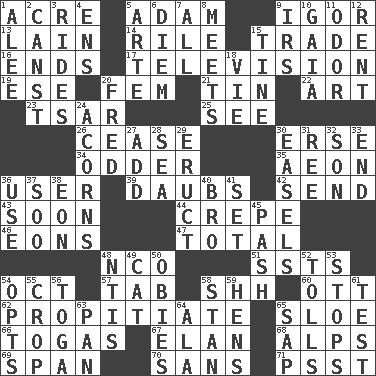 ACROSS 1. Measure of real estate 5. First man 9. Composer Stravinsky 13. (Had) reclined 14. Cause heat under the collar 15. Buy and sell 16. Extremities 17. Boob tube 19. Compass dir. 20. Opposite of masc. 21. Shallow baking pan 22. Nonscientific branch of learning 23. Russian ruler of old 25. Perceive with the eye 26. Stop 30. Celtic language 34. More peculiar 35. Period of immesurable duration 36. One who makes use of a thing 39. Applies to a surface 42. Transmit 43. Within a short period 44. Streamer paper 46. Immeasurably long periods of time 47. Add up to 48. Non-commissioned officer (abbr.) 51. Fast planes 54. Sep. follower 57. Keyboard key 58. Quiet! 60. Baseball player Mel 62. Appease 65. _ gin 66. Ancient Roman robes 67. Flair 68. High mountains 69. Connect, as a bridge 70. Without 71. Inconspicuous attention getter DOWN 1. Toward shelter 2. 2nd pers. sing. pres. of can (arch.) 3. Amusement-park features 4. Followers of ems 5. Johnson of "Laugh-In" 6. South Vietnam president (1954) 7. Everything 8. Confronts 9. Big collection agency 10. Greek goddess of the earth (variant) 11. Aroma 12. Monthly bill 15. Prong on a fork 18. Compete 20. Flintstone 24. Oak nuts 27. Find the sum of 28. Ocean 29. Spew [out] 30. Artist's stands 31. Portuguese money of account (variant) 32. Male child 33. Conclusion 36. Purpose 37. "Barney Miller" actor Jack 38. Age 40. Sis' sibling 41. Arrange properly for use 45. Romantic infatuation 48. Nuclear Threat Initiatives 49. Domesticated feline 50. Off-Broadway awards 52. For Whom the Bell _____ 53. Obstructs or blocks passage 54. Chooses 55. Riding implement 56. Ancient Roman robe 58. Comedian Laurel of Laurel & Hardy 59. Coop moms 61. Trial 63. Baking dish 64. Insect wing 65. Plant excrement