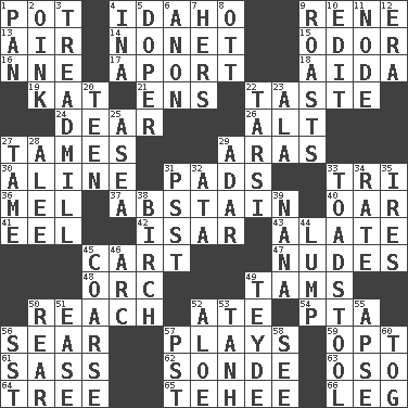 ACROSS 1. Cooking vessel 4. Potato state 9. French philosopher Descartes 13. Wind 14. Music written for nine 15. Aroma 16. Compass dir. 17. To the left, to Queeg 18. Opera by Verdi 19. Krazy ___ of comics 21. Followers of ems 22. Clothes sense 24. Letter starter 26. The first octave above the treble staff 27. Makes less strong or intense 29. Ancient river in northeast Turkey 30. Place in a line 31. Groovy apts. 33. Three (prefix) 36. Cartoonist voice _ Blanc 37. Choose not to consume 40. Rowing implement 41. Snakelike fish 42. Austrian river, tributary to the Danube 43. Having winglike extensions 45. Heavy open wagon 47. Unclothed pictures 48. The grampus (Milton) 49. Scottish caps 50. Arrive at 52. Had dinner 54. Parent Teacher Assoc. 56. Singe 57. Frolics 59. Elect 61. Backtalk 62. Something which is sent 63. Bear (Spanish) 64. Woody plant 65. Giggle 66. Part of a journey DOWN 1. Baking dish 2. Pig sound 3. Excercise machine 4. _ tizzy (2 wds.) 5. Drug addict 6. Soon (poet.) 7. Possessive pronoun 8. Baseball player Mel 9. Ridicules or criticizes harshly 10. Prepare for publication 11. Connecting point 12. Period 20. Adolescent 22. Tarsus (plural) 23. Insect wing 25. At sea 27. Not wild 28. Toward shelter 29. The sixth month of the Jewish calendar 31. Inconspicuous attention getter 32. _ moment's notice (2 wds.) 33. Inedible or poisonous agaric 34. Pace 35. Angers 38. A tree used for making furniture 39. Nanny 44. Mass 45. Unrefined 46. Curve 49. Miss Universe 1986, Barbara Palacios _ 50. Posterior 51. Relaxation 52. _ vera 53. Hyperbolic tangent 55. Domed church section 56. Fast jet (abbr.) 57. Pacific Standard Time (abbr.) 58. Observe 60. Coat; cloak