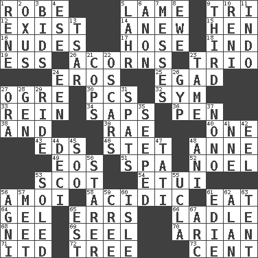 ACROSS 1. Loose flowing garment 5. Unable to walk 9. Three (prefix) 12. Have an existence 14. Afresh 15. Layer 16. Unclothed pictures 17. Flexible conduit 18. Working for oneself (abbr.) 19. Curvy letter 20. Oak nuts 23. Musical group of three 24. Greek god of love 25. Mild oath 27. Legendary monster 30. Personal Computers (abbr.) 32. Symbol (abbr.) 33. It's straight from the horse's mouth 34. Plant excrements 36. Writing instrument 38. Added to 39. Actress Charlotte 40. Single 43. Begley and Asner 46. Proofreading order 48. Singer Murray 49. Greek goddess of the dawn 51. Health resort 52. Christmas carol 53. Highlander 54. Needle case 56. Mine, in Marseilles 58. Being or containing an acid 61. Erode 64. Set 65. Blunders 66. Dipping utensil 68. Born 69. Stitch closed the eyes of (a falcon) 70. Believer in; advocate of (suffix) 71. It would 72. Family _ (genealogy) 73. Penny DOWN 1. French philosopher Descartes 2. The longest river in Central Asia 3. Auction offers 4. Compass dir. 5. Cowardly lion portrayer 6. At once, immediately (arch.) 7. Makes clutter 8. She-sheep 9. One of three equal parts 10. Painter Guido (1575-1642) 11. _ china 13. Russian ruler of old 21. 911 reaches them 22. Motion picture awards 23. Docile 24. Car or cant ending 26. Hustle 27. Mouth or opening 28. Commissioned military rank (abbr.) 29. Travel on an animal 31. Arguments over trivial matters 35. Oozed 37. Words to Nanette 41. Compass dir. 42. Snakelike fish 44. Tenth: prefix 45. "Barney Miller" actor Jack 47. Jacques of French films 48. Cuckoo 50. A viewer who gazes fixedly 53. Having a sole or soles 55. Southern CA. univ. 56. Hindu god of fire 57. Rendezvous 59. Algonquian 60. Capri or Wight 61. Singer Brickell 62. Actor Alda or Thicke 63. Portable shelter 65. Eastern Standard Time (abbr.) 67. Curve