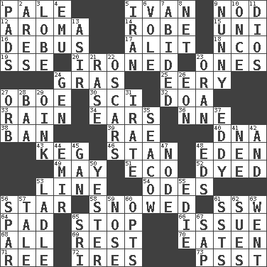 ACROSS 1. Light colored 5. _ the terrible 9. Dreamland 12. Scent 14. Loose flowing garment 15. University (slang) 16. To get out of a bus 17. Came down and settled, as after flight 18. Non-commissioned officer (abbr.) 19. Compass dir. 20. Pressed 23. Washington bills 24. Pate de foie ____ 25. Suggestive of the supernatural 27. Mitch Miller's instrument 30. _-fi 32. ___ good deed 33. Precipitation 34. Hearing organs 36. Compass dir. 38. Bar 39. Actress Charlotte 40. Heredity factor (abbr.) 43. Cask 46. Comedian Laurel of Laurel & Hardy 48. Paradise 49. Can I? 51. Environmental prefix 52. Colored 53. Actor's bit 54. Lyric poems 56. Play the lead 58. Overwhelmed 61. Compass dir. 64. Writing tablet 65. Cease 66. Come out of 68. Everything 69. Take ten 70. Ingested 71. To riddle 72. Angers 73. Inconspicuous attention getter DOWN 1. Groovy apts. 2. Ancient Greek god of war 3. Ear part 4. Australian flightless bird 5. SW Asia republic 6. Grand slam 7. Remained 8. Fish or hair follower 9. Pet term 10. Single time 11. "Vaya con ____" 13. SW Saudi Arabia district 21. To erase 22. Motion picture awards 23. Northwest Algerian city 24. Commissioned military rank (abbr.) 26. Period of immesurable duration 27. Globe 28. Sound made by sheep 29. Pig sound 31. Feeling or showing extreme anger 35. Manatee 37. Whirlpool 41. Born 42. Plus 44. Arab leader 45. Separate the seeds from cotton 47. Thickened enlargement 48. Begley and Asner 50. Last past 53. Dipping utensil 55. Singer Brickell 56. Practice fight 57. Story 59. Sense of smell 60. Chooses 61. Fast planes 62. Institutes legal proceedings 63. Left 65. Indian title of respect (Mr.) 67. Plant excrement