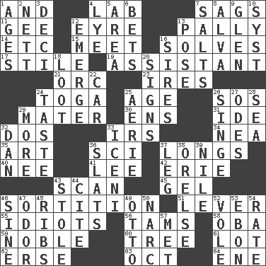 ACROSS 1. Plus 4. Experiment locale 7. Droops 11. Unit of force equal to gravity 12. Jane of fiction 13. Chummy 14. And so on (abbr.) 15. Rendezvous 16. Finds the solution 17. Vertical member of a panel or frame 19. Aide 21. The grampus (Milton) 23. Angers 24. Ancient Roman robe 25. Grow older 26. Distress signal 29. Mother 30. Followers of ems 31. Binary compound 32. Two (Sp.) 33. Big collection agency 34. Teachers' org. 35. Nonscientific branch of learning 36. _-fi 37. Yearns 40. Born 41. Area sheltered from the wind 42. 4th largest of the Great Lakes 43. Skim 45. Set 46. Making a chance decision by using lots 51. Prying instrument 55. Foolish or stupid persons 56. Scottish caps 58. Chief or king in Benin or Nigeria 59. Impressive in appearance 60. Relationship diagram 61. Car dealer's back yard 62. Celtic language 63. Sep. follower 64. Compass dir. DOWN 1. Grows older 2. Remaining after all deductions 3. Tenth: prefix 4. Potassium hydroxide 5. Type of rug 6. Antes 7. Table seasonings 8. Inventor's middle name 9. Small, secluded valley 10. System (abbr.) 12. Develop 13. Airs 16. Begets 18. Spoils 20. Public displays of written messages 22. 4-wheeled motor vehicle 24. Clothes sense 25. Nest on high 26. Burn superficially 27. Lyric poems 28. Ocean 29. Greater amount 32. One of the 12 tribes of Israel 33. Ancient Celtic tribe of eastern Britain 36. Narrow boards 37. Part of a journey 38. Threatening words 39. The longest river in the world 43. Fur scarf 44. Quote 46. Trig term 47. Scent 48. Chest bones 49. "Beetle Bailey" pooch 50. Drug cop 52. Grand slam 53. Inky black, to poets 54. Pace 57. Was introduced to