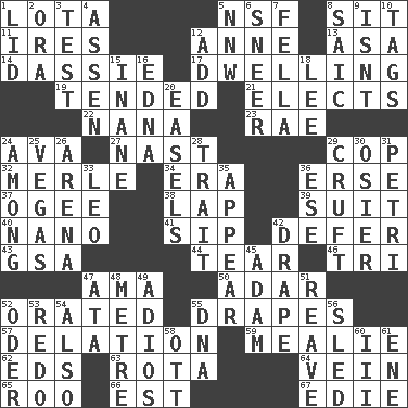 ACROSS 1. Globular water bottle used in Asia 5. Overdraft (abbr.) 8. Be seated 11. Angers 12. Singer Murray 13. White ___ sheet 14. Small ungulate mammals of Africa 17. Residence 19. Watched over 21. Opts 22. Nanny 23. Actress Charlotte 24. Actress Gardner 27. Political cartoonist Thomas 29. Police officer (slang) 32. Haggard of country music 34. Period 36. Celtic language 37. Double curve, resembling the letter S 38. Pet locale 39. Set of matching outer garments 40. Billionth: prefix 41. Small drink 42. Postpone 43. Girls' org. (abbr.) 44. Lacerate 46. Three (prefix) 47. Nursemaid (var.) 50. The sixth month of the Jewish calendar 52. Spoke pompously 55. Window treatments 57. Accusation by an informer 59. Ear of corn 62. Begley and Asner 63. Roll call or roster of names 64. Distinctive style or manner 65. Friend of Pooh 66. Eastern Standard Time (abbr.) 67. Singer Brickell DOWN 1. Flaplike covering 2. Mouth or opening 3. Trial 4. NE Netherlands city 5. Compass dir. 6. Scornful expression 7. Man or boy (slang) 8. Ketch in the Levant 9. Is not 10. Labels 12. Increase 15. Silly 16. Pulitzer Prize-winning author Ferber 18. Area sheltered from the wind 20. Artist's stands 24. Amid 25. Viva Las _ 26. Sports stadium 28. Distinguishing feature 29. An unpleasant substance 30. Flexible twig of a willow tree 31. _ dish (used to culture cells) 33. Lion 35. Become visible 36. Compass dir. 42. Window treatment 45. First of billions? 47. _ moment's notice (2 wds.) 48. Distance measurement (Brit.) 49. Goodbye (Sp.) 51. Break or tear apart 52. Baltic tributary 53. Make new 54. In addition 55. Heredity factor (abbr.) 56. Downhill vehicle 58. Baseball player Mel 60. One more than two 61. Compass dir.