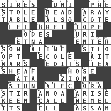 ACROSS 1. Titles for men of rank and authority 6. Single; one (prefix) 9. Before (prefix) 12. Took without asking 13. Necklace unit 14. Like ___ of sunshine 15. Eating place 16. In addition 17. ____ d'Azur (French Riviera) 18. Luau accessory 19. Cy Young winner Saberhagen 20. Drink excessively 21. Lyric poems 23. RI univ. 24. Inactive volcano in Sicily 25. Keyboard key 28. Boy, to dad 30. Place in a line 34. Grain storage tower 35. Elect 36. Learning spot: Fr. 38. Small island 39. Armed conflicts 41. Prepares for publication 43. Afternoon social gathering 44. To gather and bind into a bundle 46. Flexible conduit 48. _ moment's notice (2 wds.) 49. The Jewish people; Israel 50. Astound 51. Actor Baldwin 53. Mouth or opening 56. Tumult 57. Small Philippine buffalo 58. Get up 60. Peachy ____! 61. Give a ring to 62. Klaipeda city 63. It is 64. Pipe bend 65. Indian state DOWN 1. Fast jet (abbr.) 2. Slanted text style (abbr.) 3. Loose flowing garment 4. American author Paul (1891-1958) 5. Perceive with the eye 6. Ubangi River tributary 7. Political cartoonist Thomas 8. Wedding promise 9. Conciliate 10. Assign a rank or rating to 11. Sight organ 13. Oblong pieces of solid material 14. Oak nuts 19. Memphis, Tenn. Street 20. Third day of the wk. 22. Heredity factor (abbr.) 24. Pleas 26. Writer Wiesel 27. Roll call or roster of names 28. Sty mamas 29. Brightly colored fish 31. Frozen water 32. Lower and raise head in agreement 33. Connecticut Ivy Leaguer 37. Moral principle 40. Titan orbits this 42. "Barney Miller" actor Jack 45. Avid follower 47. Sounds asleep 49. Ardor 50. Proofreading order 51. Of or related to the anus 52. Hang loosely or laxly 54. Basketball hoops 55. At sea 56. What Jean-Claude Killy likes to do 57. Adept person 58. Nanny (var.) 59. Shade tree