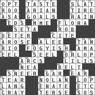 ACROSS 1. Choose 4. Clothes sense 9. Narrow board 13. Friend of Pooh 14. Believer in; advocate of (suffix) 15. Hoop that covers a wheel 16. White ___ sheet 17. Finish lines 18. Precipitation 19. Begley and Asner 21. Madame (abbr.) 22. Plants 24. Bristle 26. Director Reiner 27. Prevent from occurring 29. Quote 30. Came up 31. Toward shelter 33. Scottish cap 36. _ de Janeiro 37. Out of fashion; old fashioned 40. Wet nurse (var.) 41. Snakelike fish 42. Stitch closed the eyes of (a falcon) 43. Lowest deck of a ship 45. Arches 47. Ms. Damita and namesakes 48. Teachers' org. 49. Waist strap 50. Scornful expression 52. Slender fish 54. Hearing organ 56. Rend 57. Pitcher Ryan 59. Trim (branches) 61. Austrian-born American filmmaker Fritz 62. Related on the mother's side 63. And so on (abbr.) 64. Supercomputer manufacturer 65. Laconic 66. Mayday DOWN 1. Mouth or opening 2. Airs 3. Inedible or poisonous agaric 4. Label 5. Scent 6. Thailand, formerly 7. Falsehood 8. Followers of ems 9. Disco prop 10. One who doesn't tell the truth 11. Operatic vocal solo 12. Nine, plus one 20. Observes 22. Strips of potato fried in deep fat 23. Car dealer's back yard 25. Not kosher 27. Have the gumption 28. 4th largest of the Great Lakes 29. To provide with a ceiling 31. Matures 32. Sodium hydroxide 33. Baron Munchausen's specialties 34. Mine, in Marseilles 35. Atlas contents 38. Witty Wilde 39. Hollow 44. Cause heat under the collar 45. Disorder of the immune system 46. To separate or throw off 49. Naughty children 50. Singe 51. Grandmother 52. Went 53. Having or resembling wings 55. Printing process, for short 56. Affectionate concern, for short 57. Fish or hair follower 58. Born 60. Personal Computers (abbr.)