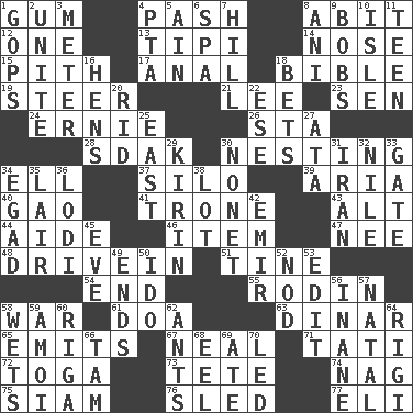 ACROSS 1. Chewing product 4. Romantic infatuation 8. "This won't hurt ____!" 12. Single 13. Native american tent (variation) 14. Sense of smell 15. Heart or essence 17. Of or related to the anus 18. Instruction Manual for Humans 19. Navigate 21. Area sheltered from the wind 23. Elected rep. 24. Bert's buddy 26. R.R. building 28. Neighbor of Neb. 30. Inhabiting a nest 34. Pipe bend 37. Grain storage tower 39. Roberta Peters solo 40. E Mali city 41. Marketplace scale 43. The first octave above the treble staff 44. Helper 46. A distinct part 47. Born 48. Popular '50s hangout 51. Prong on a fork 54. Conclusion 55. "The Thinker" sculptor 58. Armed conflict 61. ___ good deed 63. Middle Eastern gold or silver currency 65. Sends forth 67. Anneal 71. Jacques of French films 72. Ancient Roman robe 73. False hair 74. Tired old horse 75. Thailand, formerly 76. Downhill vehicle 77. Biblical high priest DOWN 1. Republicans 2. Join together 3. Distance measurement 4. Parent Teacher Assoc. 5. The 18th letter of the Arabic alphabet 6. Health resort 7. Land elevation 8. Cuckoo 9. Moves up and down 10. Capri or Wight 11. Adolescent 16. Coop moms 18. Wagers 20. To free from 22. Compass dir. 25. Compass direction 27. "One Day ___ Time" 29. Japanese brewing company 30. Music written for nine 31. SW Asia republic 32. Mediterranean tributary 33. Yard entry 34. Mild oath 35. Den 36. Farming town in central California 38. Car dealer's back yard 42. Arab leader 45. First lady 49. Conclusions 50. Wedding promise 52. Lower and raise head in agreement 53. Prepare for publication 56. Lacking in sense or substance 57. Relating to or accompanying birth 58. Soaks 59. Mine, in Marseilles 60. Port city in Latvia 62. Pismires 64. Swiss mountan, "Queen of the Mountains" 66. Scottish cap 68. Snakelike fish 69. Had dinner 70. Directed