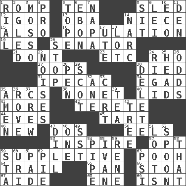 ACROSS 1. Play 5. Nine, plus one 8. Downhill vehicle 12. Russian composer Stravinsky 13. Chief or king in Benin or Nigeria 14. Sibling's daughter 15. In addition 16. Census information 19. French article 20. Legislator 21. Do not 23. And so on (abbr.) 24. 17th letter of the Greek alphabet 27. I made a mistake 30. Passed on 31. Medicinal drug used to evoke vomiting 34. Mild oath 35. Curves 38. Music written for nine 40. Hats (slang) 41. Greater amount 42. Cigar-shaped 44. Nights before holidays 45. Small pie 46. ___ Haven, CT 47. Two (Sp.) 50. Snakelike fish 53. Motivate 57. Elect 59. Supplementary 63. "Silly old bear" 64. Hang back 65. Baking dish 66. Portico 67. Helper 68. Compass dir. 69. Is not DOWN 1. Monetary unit of Yemen 2. Stared 3. With motion or animation 4. Adept person 5. Drink excessively 6. Inky black, to poets 7. California wine valley 8. Be seated 9. Flowery wreath 10. Environmental prefix 11. Lair 14. Drug cop 17. Shoshoni 18. Car dealer's back yard 20. Constrict 22. Annoying sounds 24. Swiss mountan, "Queen of the Mountains" 25. Froth on beer 26. Probability 28. Writing instrument 29. Highlander 30. Keyboard key 32. One (Scot) 33. Sure thing 35. So be it 36. Be footloose 37. Group working together 39. Afternoon social gathering 43. Family _ (genealogy) 47. Deli pickle 48. Single 49. Fast jet (abbr.) 51. Plunders 52. Soup utensil 54. Corncob 55. _ the terrible 56. French philosopher Descartes 58. Not this but _ 59. R.R. building 60. RI univ. 61. Groovy apt. 62. Sliced dessert 63. Air pressure measure (abbr.)