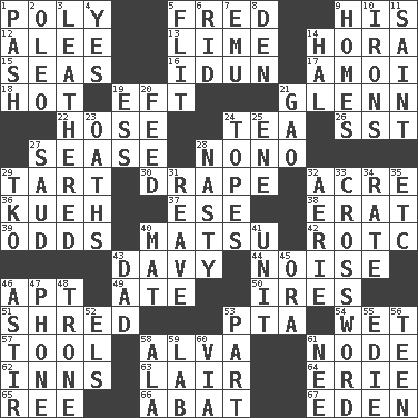 ACROSS 1. More than one (prefix) 5. Flintstone 9. Part of HMS, perhaps 12. Toward shelter 13. Welles in "The Third Man" 14. Israeli folk dance 15. Oceans 16. Goddess of spring and wife of Bragi 17. Mine, in Marseilles 18. Being at a high temperature 19. Lizard (obsolete) 21. American astronaut and politician John 22. Flexible conduit 24. Afternoon social gathering 26. Fast jet (abbr.) 27. Gospel singer Marvin 28. Words to Nanette 29. Small pie 30. Window treatment 32. 43,560 square feet 36. Malaysian steamed pastry 37. Compass dir. 38. Part of Q.E.F. 39. Probability 40. Taiwanese island in East China Sea 42. College mil. group 43. _ Jones' Locker 44. Annoying sound 46. Fitting 49. Had dinner 50. Angers 51. Tear up 53. Parent Teacher Association (abbr.) 54. Soggy 57. Implement 58. Inventor's middle name 61. Thickened enlargement 62. Taverns 63. Den 64. One of the Great Lakes 65. To separate or throw off 66. Blind as ____ 67. Locale of original sin DOWN 1. Romantic infatuation 2. Butter sub 3. Tough but pliablecoriaceous 4. Affirmative reply 5. Sudden quick movement 6. To free from 7. Australian flightless bird 8. Lair 9. Dwellings 10. Removes the wrinkles 11. Inhabitant of Heaven 14. Actor Linden 19. Double-curved letter 20. Nourish 21. E Mali city 23. Expletives 24. Drinks excessively 25. Compass dir. 27. Saudi Arabian king (1953-1964) 28. Smutty 29. Ring climax 31. Rob, plunder, or pillage 32. Nest on high 33. What you're doing now 34. Pace 35. And so on (abbr.) 40. Floor protector 41. A single undivided whole 43. June honoree 45. Mouth or opening 46. Moving or stirring 47. Give a jingle 48. Heavy duty weighing machine 52. Raised railways 53. Role in a play 55. Singer Brickell 56. Adolescent 58. In the manner of 59. Experiment locale 60. By way of 61. Born